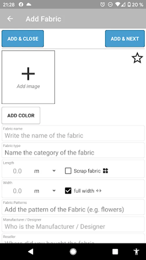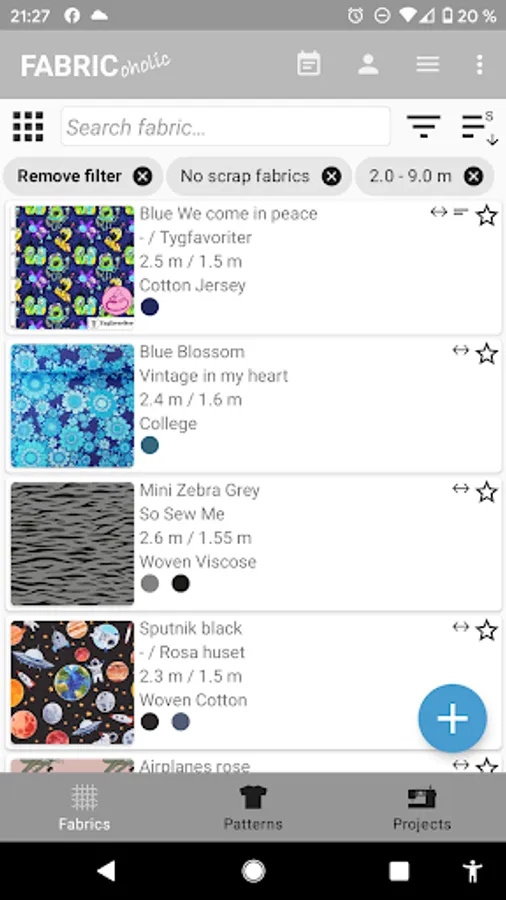 Do you like to sew clothes?! Then this is the app for you. Add in the app the fabrics you store in your shelves and the ones you have just ordered. Then you know easier which fabrics you can work with. When you plan your next project, open the app instead. You don't have to dig around in the piles and take out and measure every piece of fabric you own. Your sewing patterns can also be added into the app to plan your next sewing project. Projects can be created and you can link fabrics and patterns to it. Write comments about changes you made to remember the next time you use that pattern.