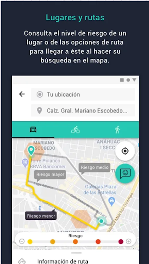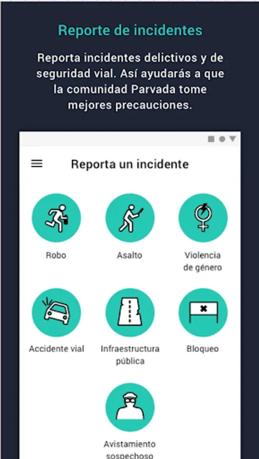With Parvada you will be able to know the risk level of areas and routes, as well as report security incidents that you find in your path, thus contributing to other users being able to prevent security incidents in their environment.