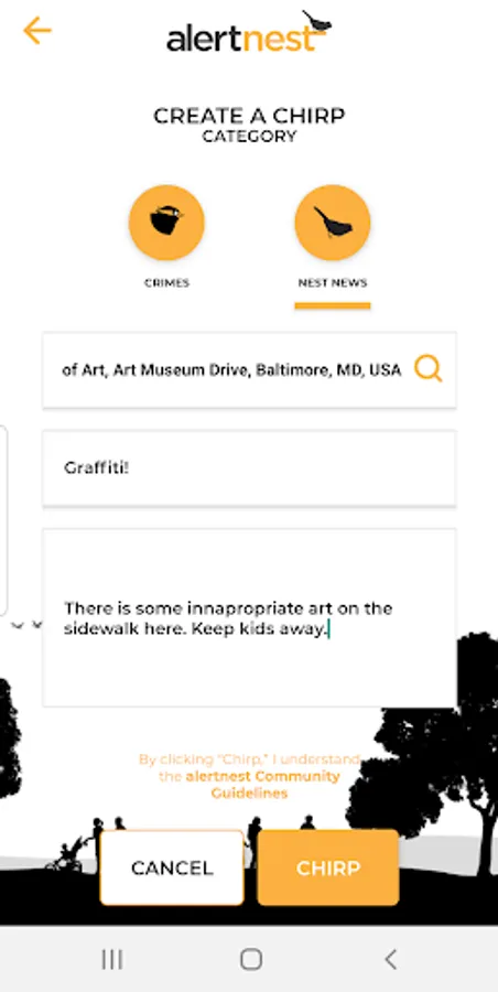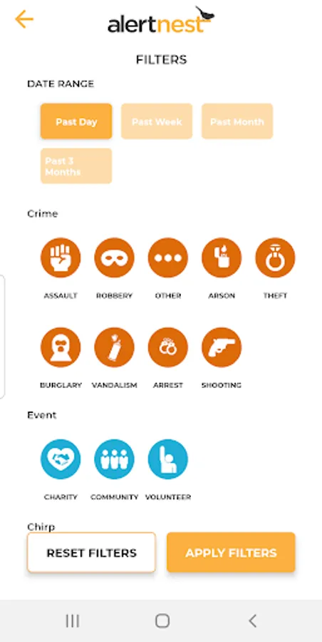 A connected community is the first line of defense, so if you witness criminal activity or have an update, alertnest encourages you to share it through our crowdsourcing capability, chirp. While local law enforcement does what it can, alertnest understands that those who know your neighborhood best are the people who live in it—and the sharpest eyes on the ground are yours.