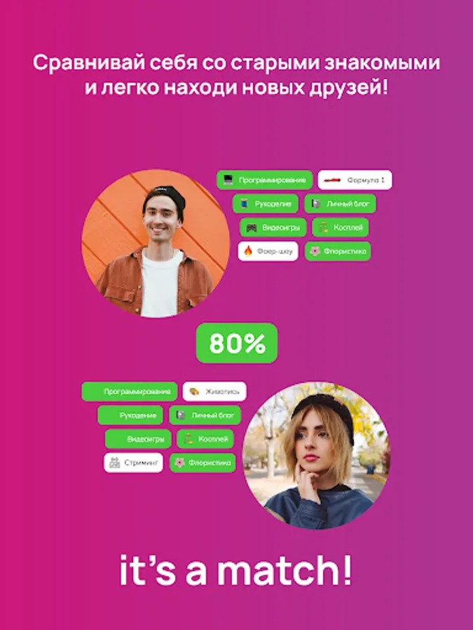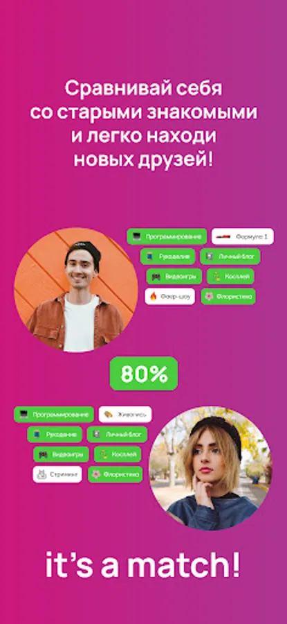 Interests will tell you what you have in common with other users, highlight what's really important, and even show you how similar you are. The match percentage will help you stop looking and not pass by someone you might not even notice before.
