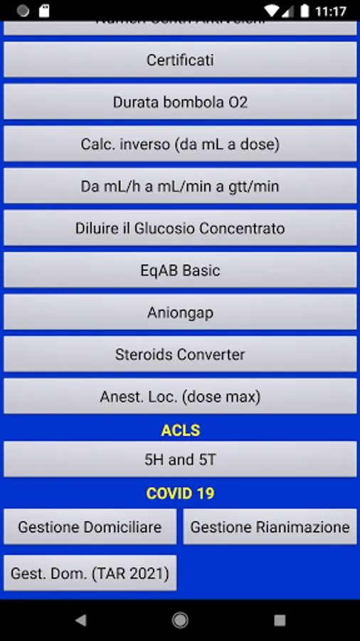 A section is dedicated to the calculation of scores as Glasgow, TIMI, Wells, CURB-65, Surface burned, SOFA, etc.