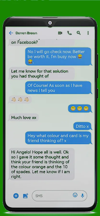 You ask your friend to pick up the phone (as you don’t want to touch it) and to read the full reply. They will be utterly amazed to see that the psychic has correctly guessed both the freely thought of colour and playing card.