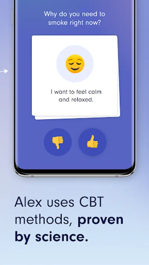 Alex is your AI companion supporting you as you become smoke-free and start a new healthy lifestyle. Alex provides tools for you to cut down on smoking and understand why you smoke. The core of Alex uses scientifically proven therapy methods based on CBT.