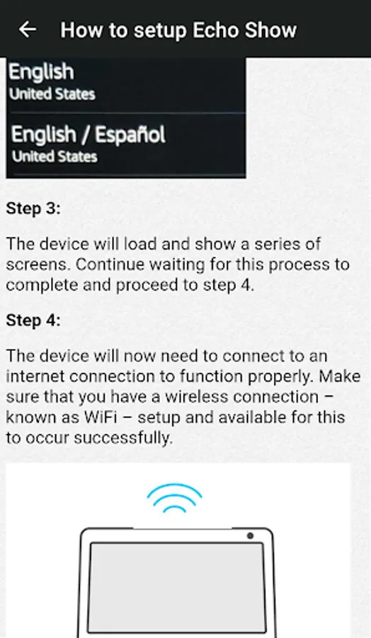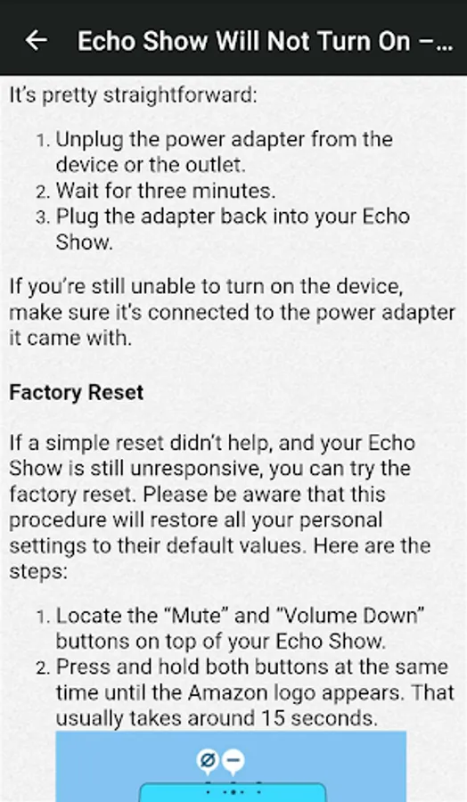 Our mobile app includes information about the Amazon Echo Show 8, how to set up and use it, the device's features, and what to do when it won't turn on.