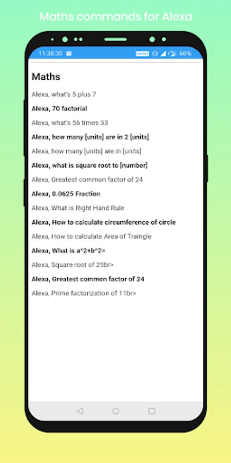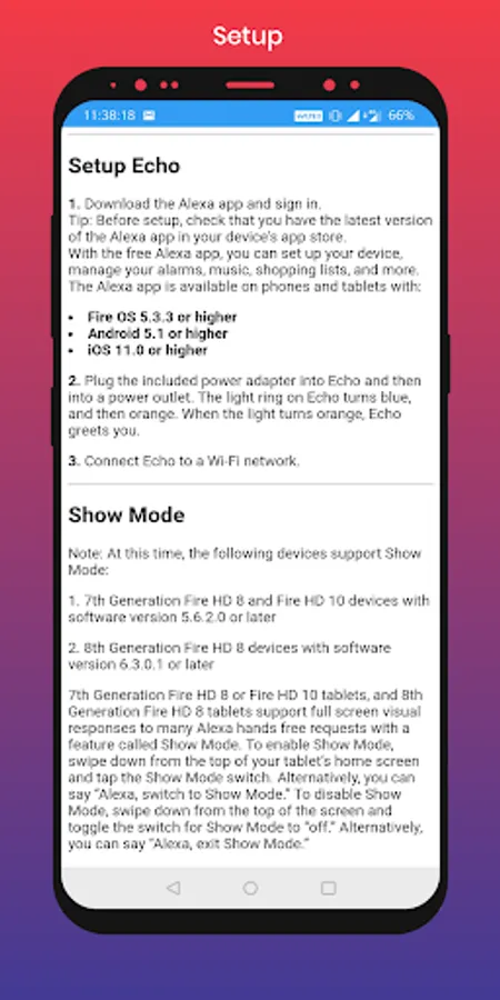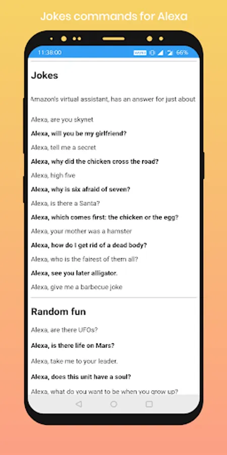 This app provides list of Alexa commands. By using this app you can get idea what can you ask to your echo device or alexa.