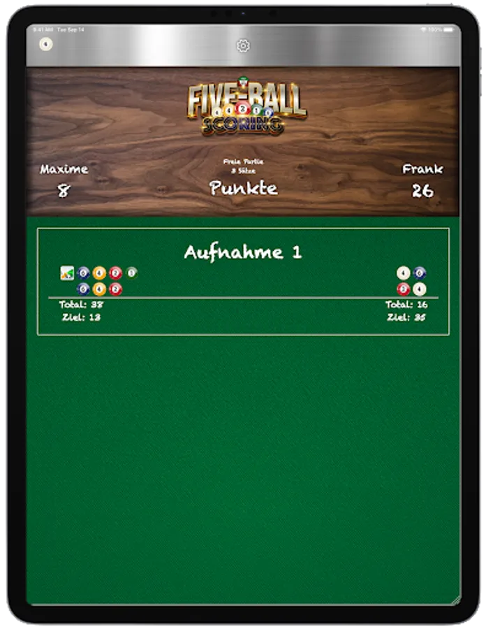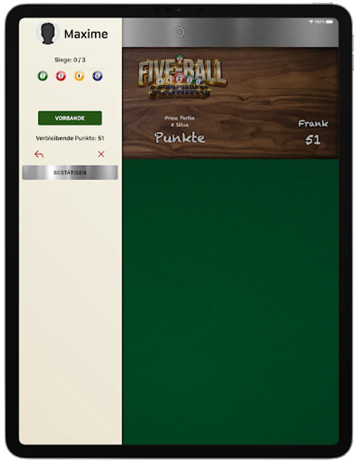 In addition, many players found it noticeably difficult to calculate the points played per shot in their heads, which often led to discussions and game cancellations. In order to absorb all this and to optimize the fun of this still quite young discipline of carom billiards for everyone, we then developed an app for iOS and Android - the FIVE-BALL SCORING APP - specially tailored to our variant of FIVE-BALL CARAMBOL.