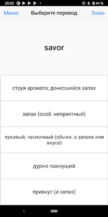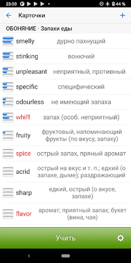 With the correct passage of the entire set of exercises, the percentage of word learning increases. If it is wrong, on the contrary, it decreases. The words you misspelled are marked according to the type of error