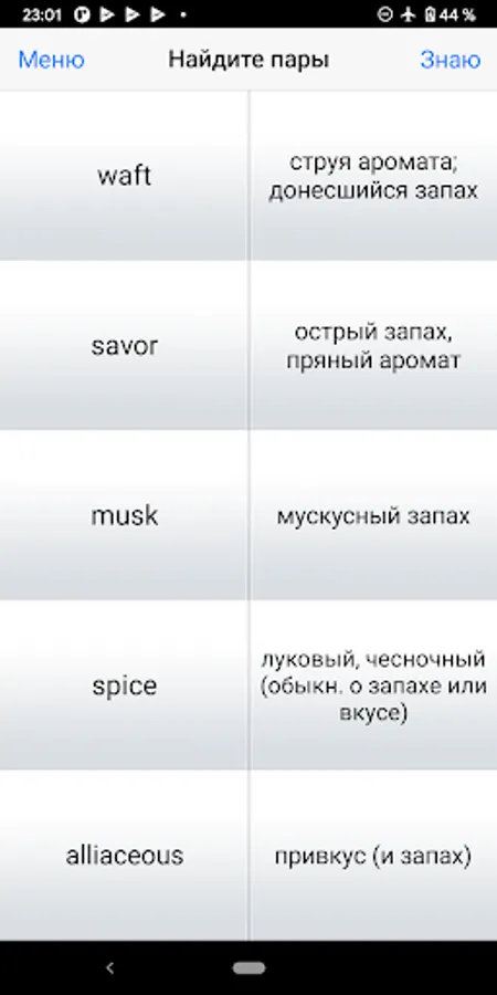 Exercises: "Find pairs", "Select translation", "Remember translation"