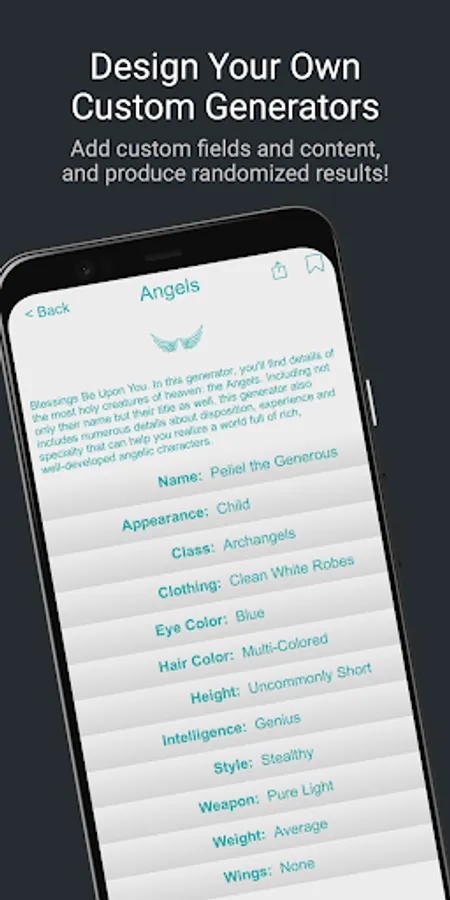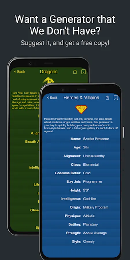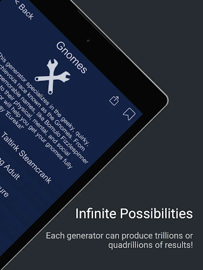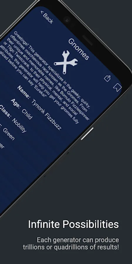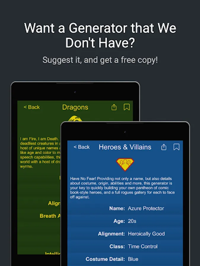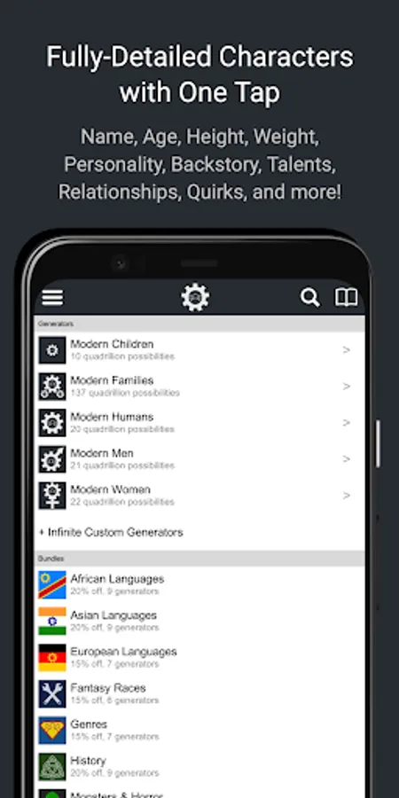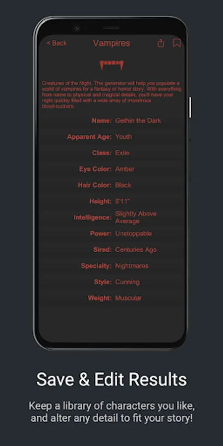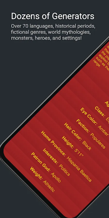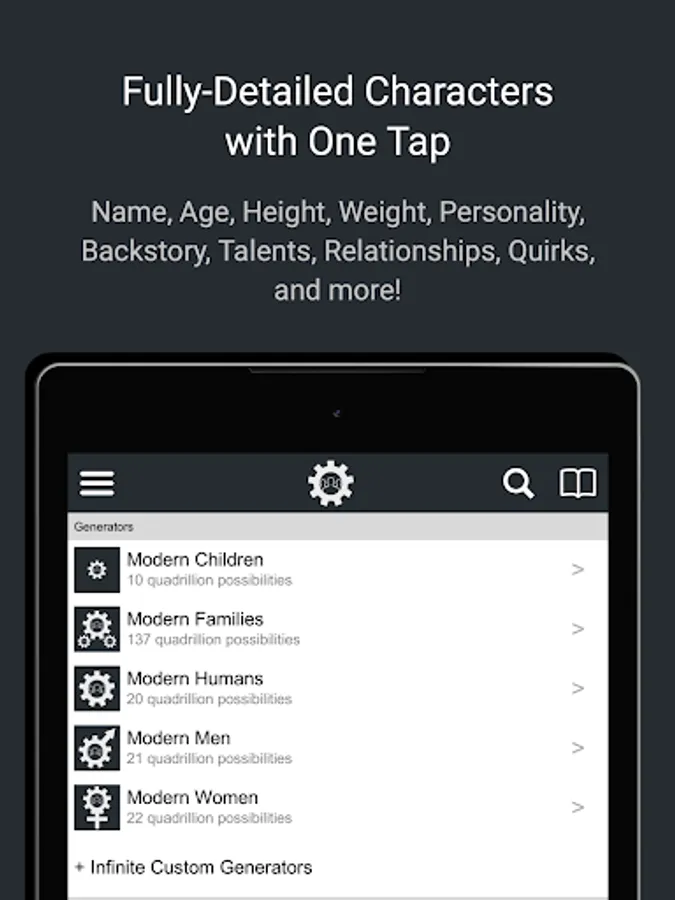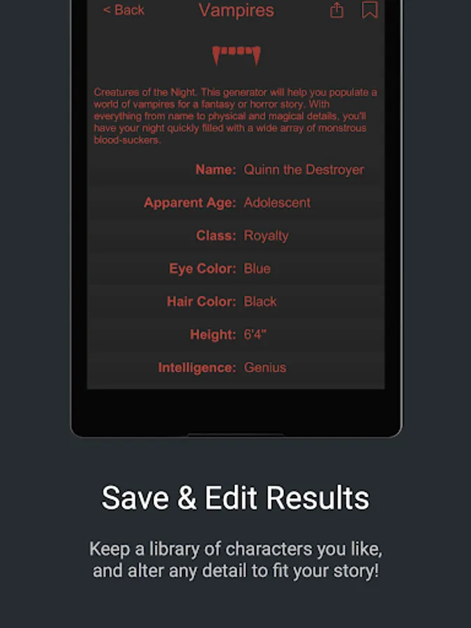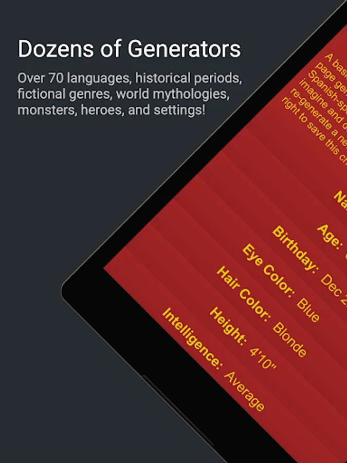 Pulling from an extensive database of names and vital statistics, Characterize can generate literally quadrillions of new characters! That's more than enough for even the most ambitious of projects, and plenty to help you find the perfect avatar for your next story. You can even choose between fantasy, pirates, modern names, and more to give your character the authentic details that matter. Save your favorites, and bring up a whole new character with a quick tap!