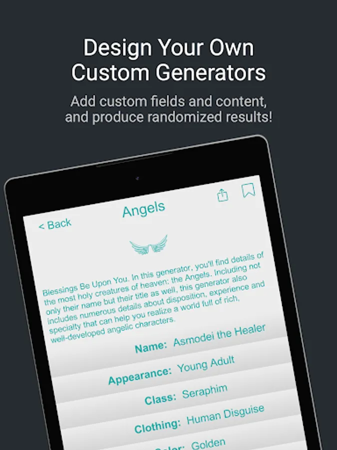 - Save your creation for reference with a few quick taps, or share with friends! Then, view your saved characters anytime from the selector. Whether you're finally naming that long-discussed protagonist, populating a gaming world or even challenging yourself to write a story without knowing who the players will be beforehand, Characterize makes it easy to create realistic, fully realized characters at the touch of a button.