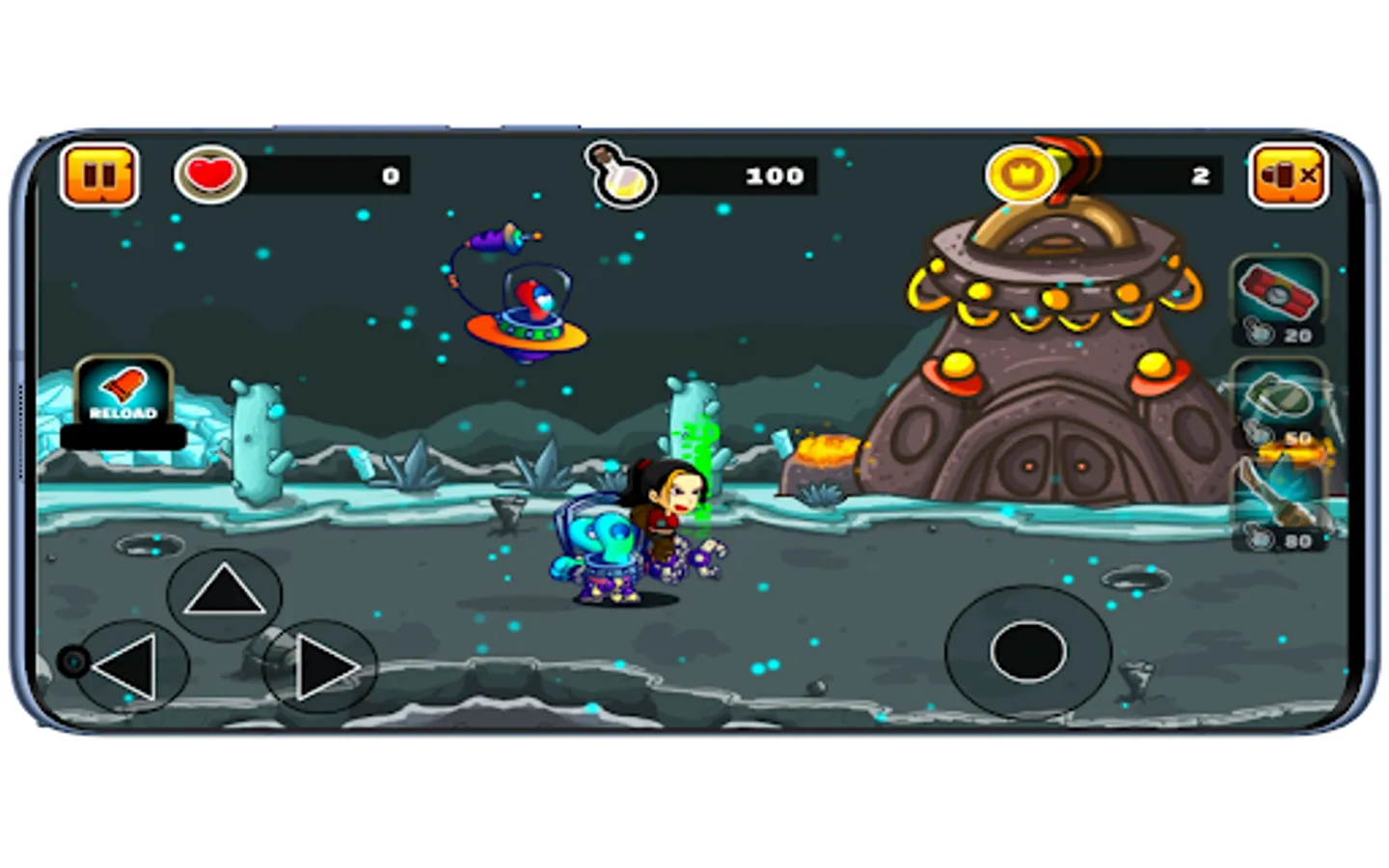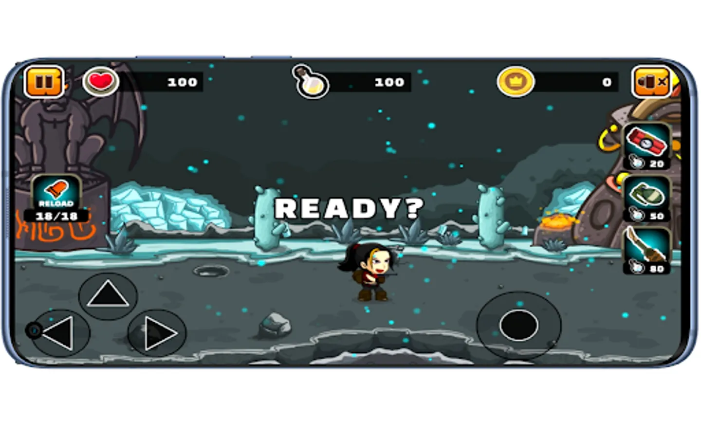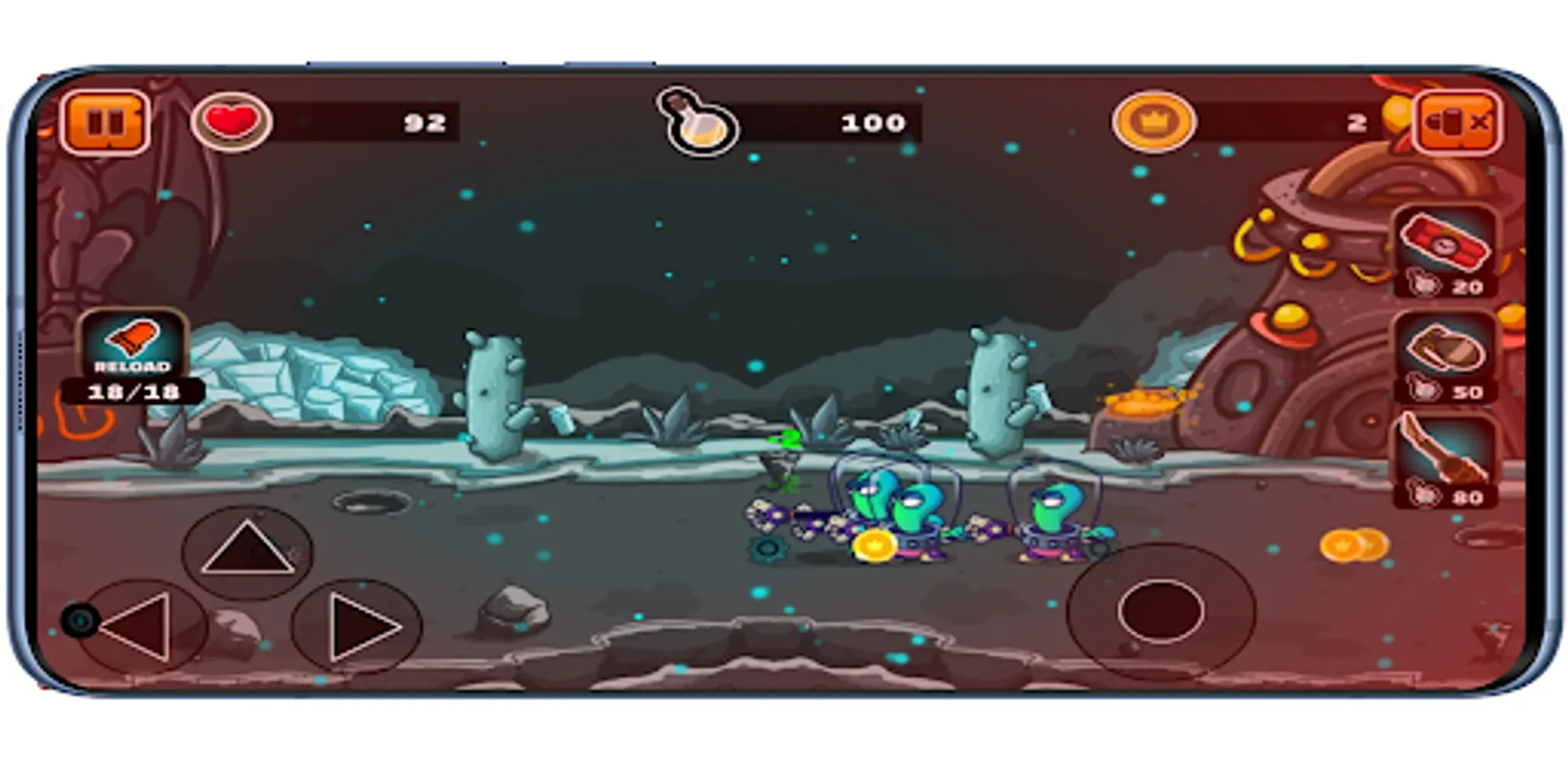 To control the game, use the on-screen buttons. In the lower left corner, you'll find the jump, move left, and move right buttons. The shoot button is in the lower right. Hold it to shoot, and adjust your shot aim by moving your finger around the button. The game is easier to play on desktop devices due to the larger screen size, which provides better aim and control.