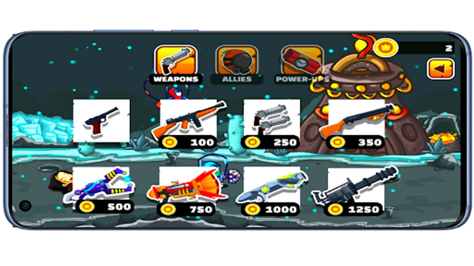 You can unlock different weapons, including a rifle, dual revolvers, shotgun, laser gun, fireball, rocket launcher, and gatling gun. Once unlocked, you can switch between them repeatedly. In general, the more expensive weapons are better, but the rocket launcher can be better than the gatling gun.