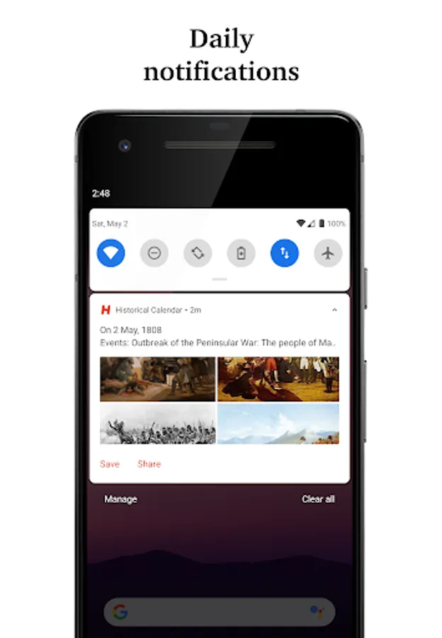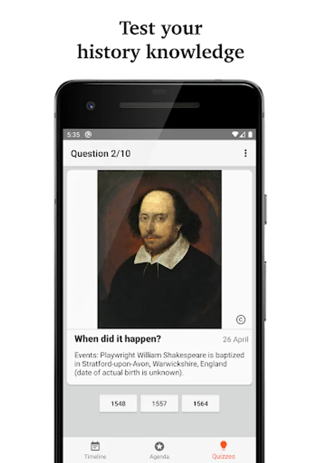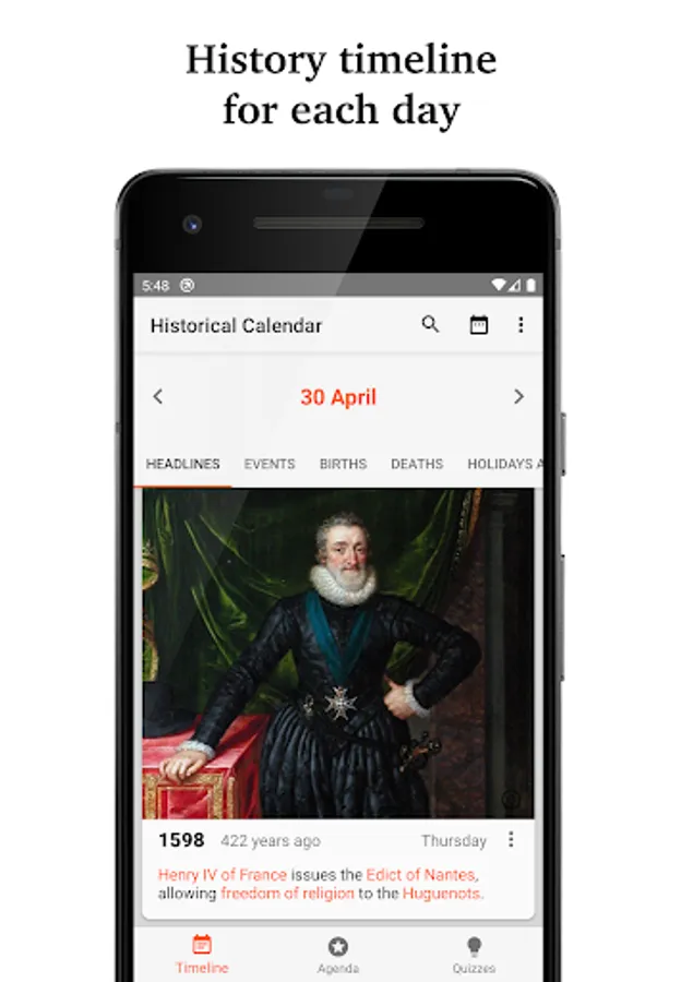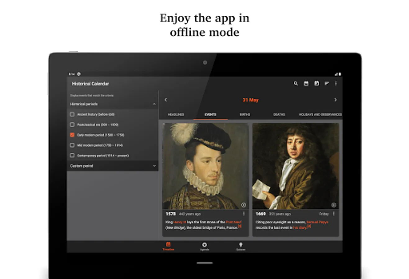 • Timeline. History timeline for each day with illustrated events. You can filter based on historical periods and search for specific people or places.