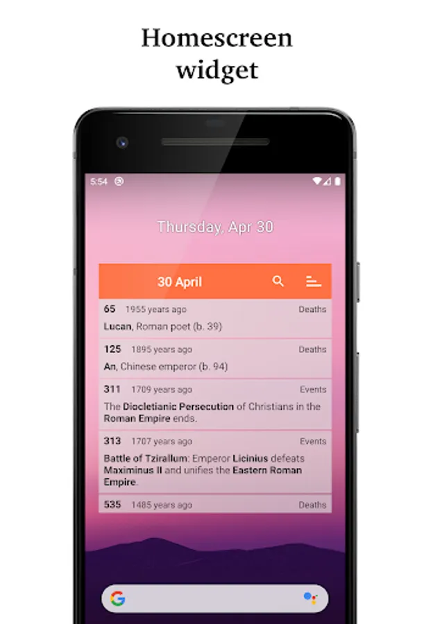 • Homescreen widget. Have a quick view on the historical facts of the day by using the widget.