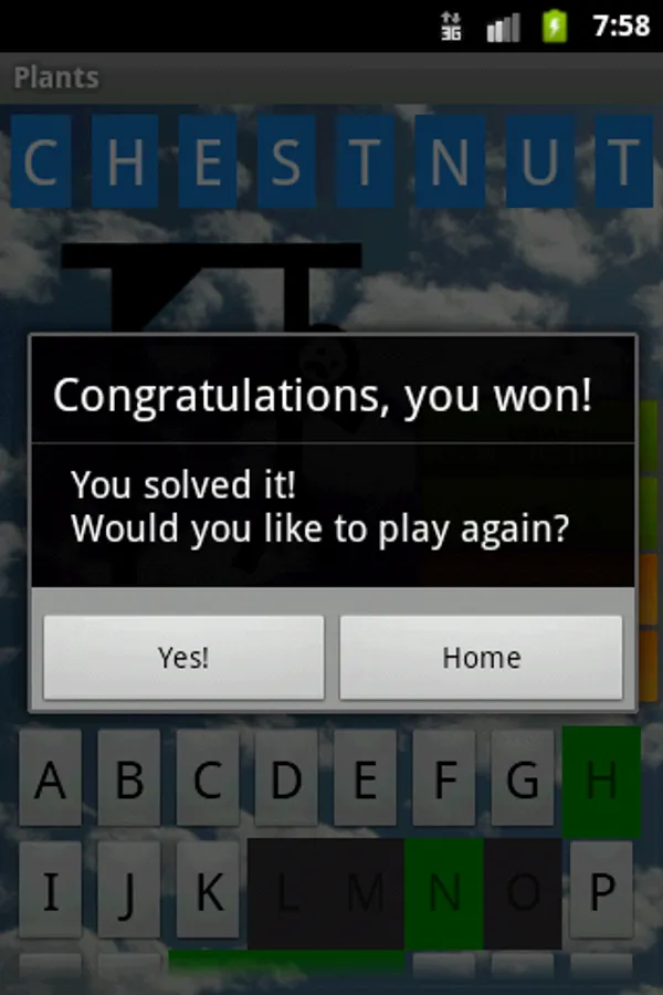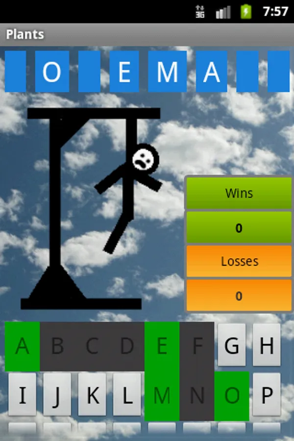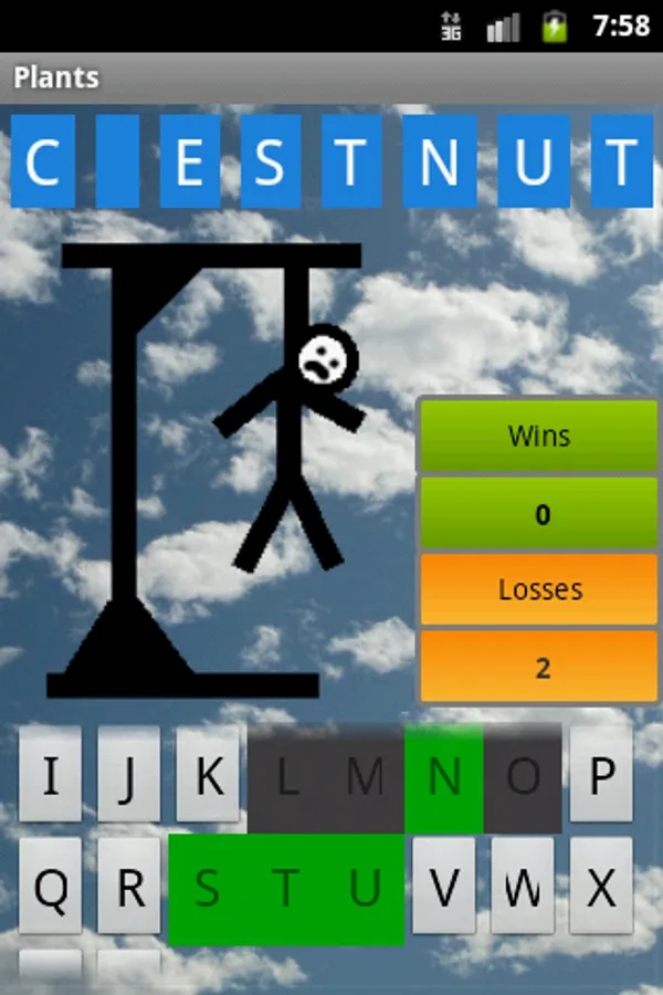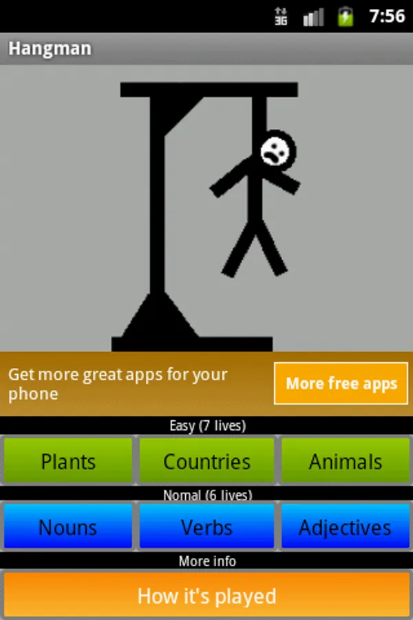 This is a version of the well known game Hangman. You have to guess the letters in order to find out the hidden word. There are 6 categories and 2 difficulty levels, one with 6 lives and another one with 7. After 6/7 tries, you loose the game and get hanged.