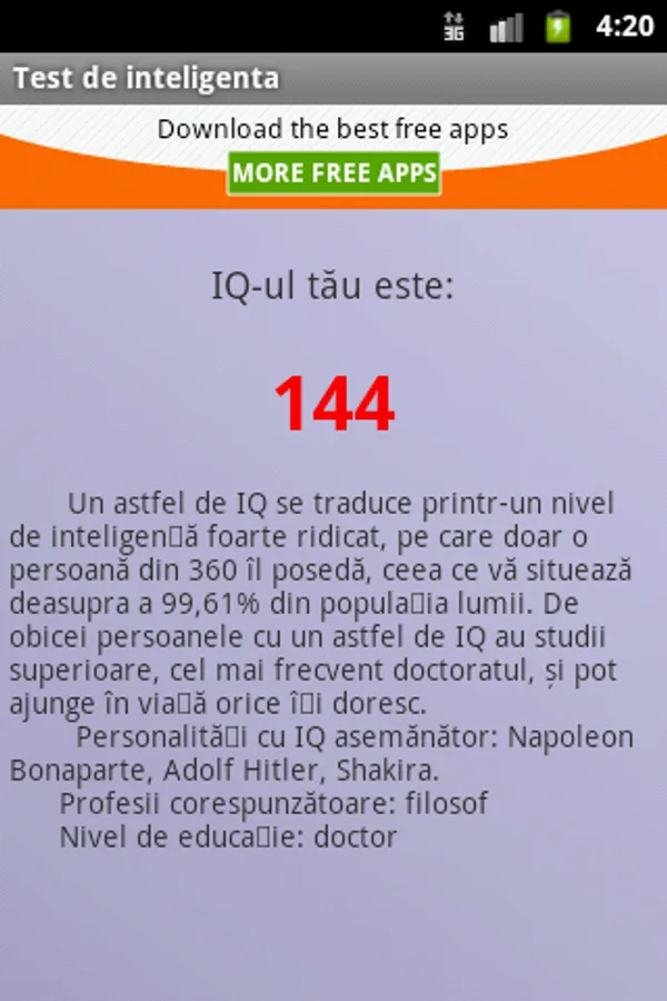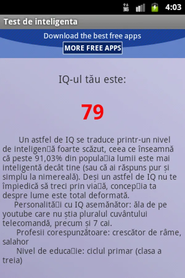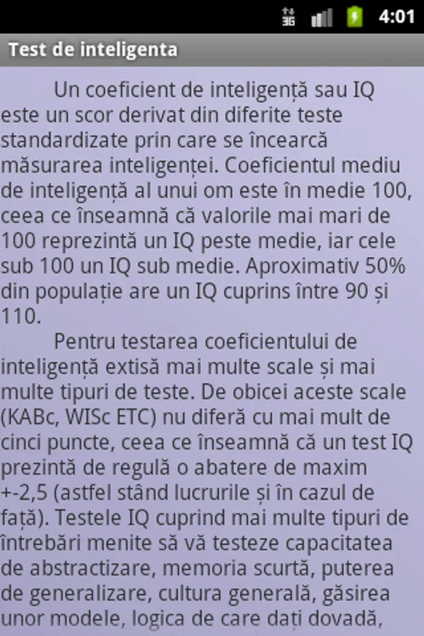 It's free, it works perfectly, it is quite difficult for those without any education, is installed directly on the external card does not require any data from users, occupies little place (about 0.6 MB), is designed intuitive, contains, besides the test, and general information about IQ.