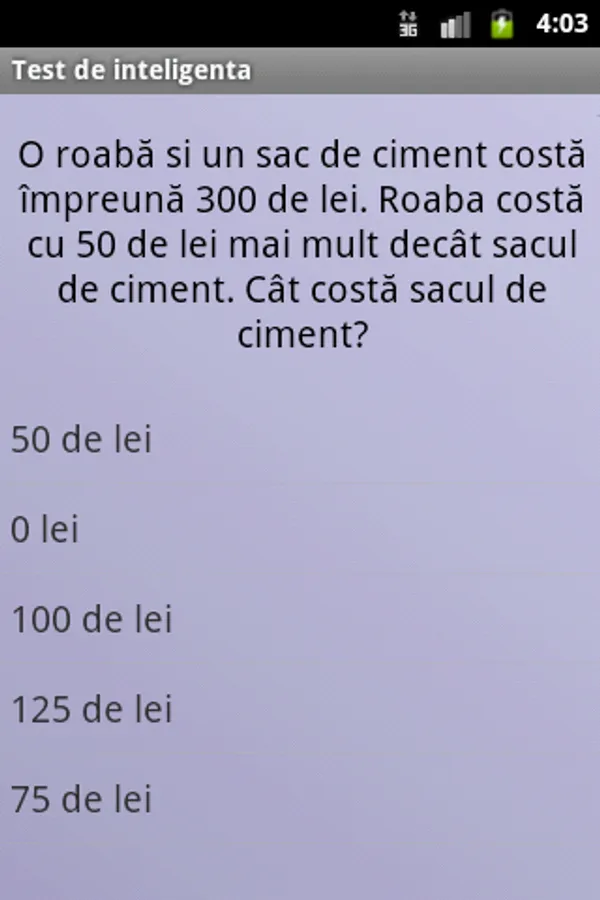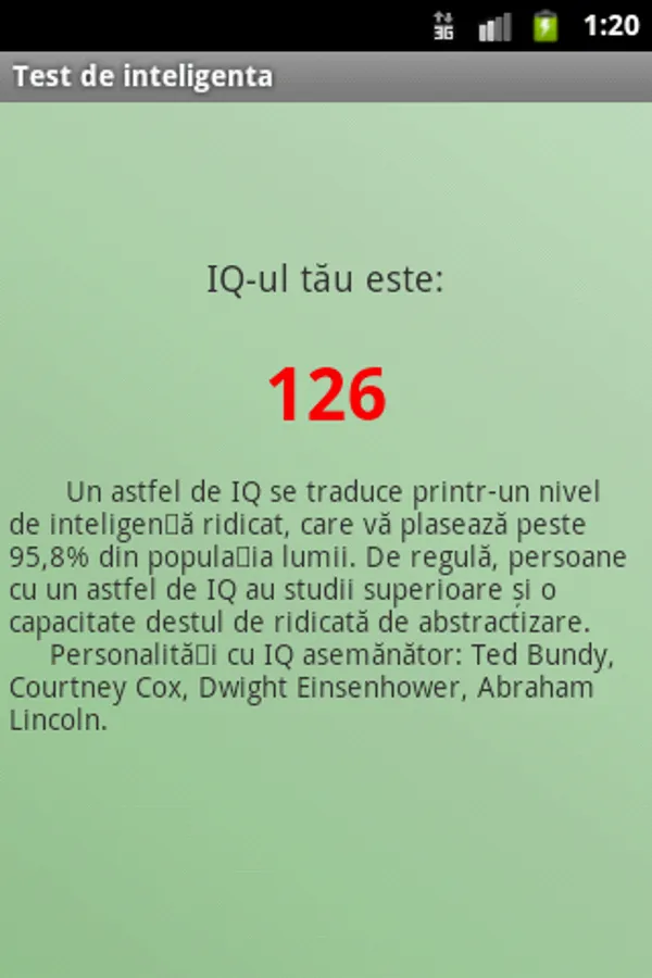This is a well planned application through which you can learn Intelligence quotient (IQ). No need to register, you are not required to provide any data, all you have to do is answer 50 questions. Before you begin the test, please go through the play with 'Read before you start'. After you answer and the 50th question, do you give the result (if you want to check that the test works, you can answer random questions and see the answer). The large number of questions translates to high accuracy, the test is not designed a bottom, but a method has to be IQ. So, please, start it unless you are prepared to learn the result.
