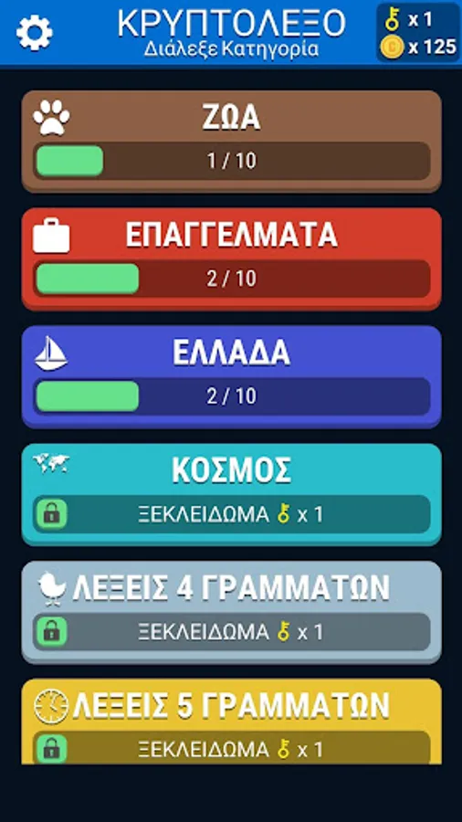 b) solving predefined word levels in each category that lead to the acquisition of "keys" to unlock more categories