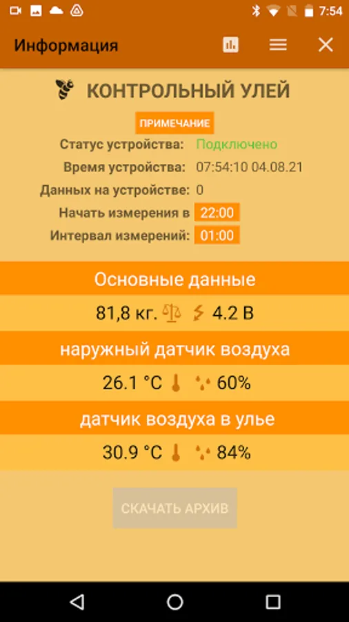 SmartBee scales automatically record changes in hive weight and environmental parameters and then transmit all data to your smartphone via Bluetooth. Further, you can analyze this information and see not only the daily gain, but also understand how much the family releases worker bees or see the dependence of the bribe on the air temperature. SmartBee scales together with this program will become an indispensable tool for a modern beekeeper.