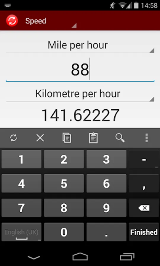Just pick two units (for instance mph and km/h), write your number (for instance 88) and the result instantly appears: 88 mph = 141.62 km/h! You no longer need to remember complicated conversions (or do you prefer having to remember that 1 mph = 1.609344 km/h and to calculate 1.609344 x 88?) ! And there is also a "swap" button in case you now want to convert km/h to mph.