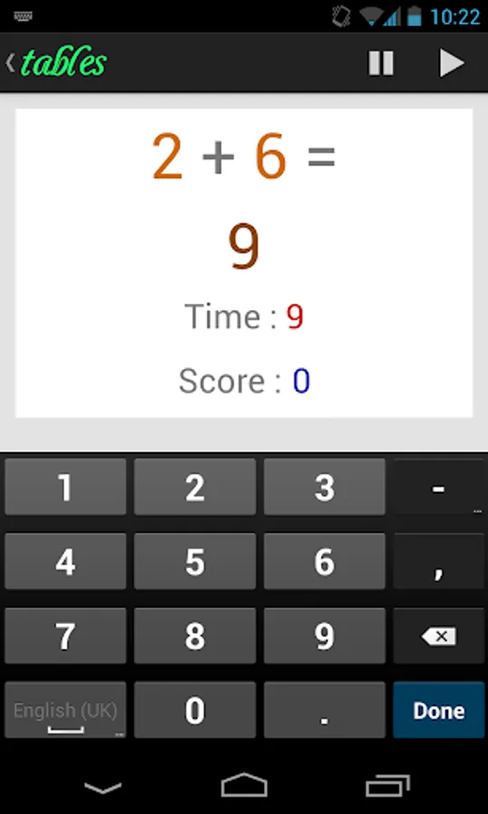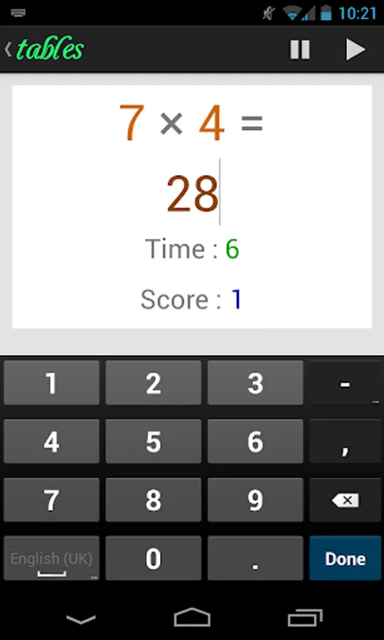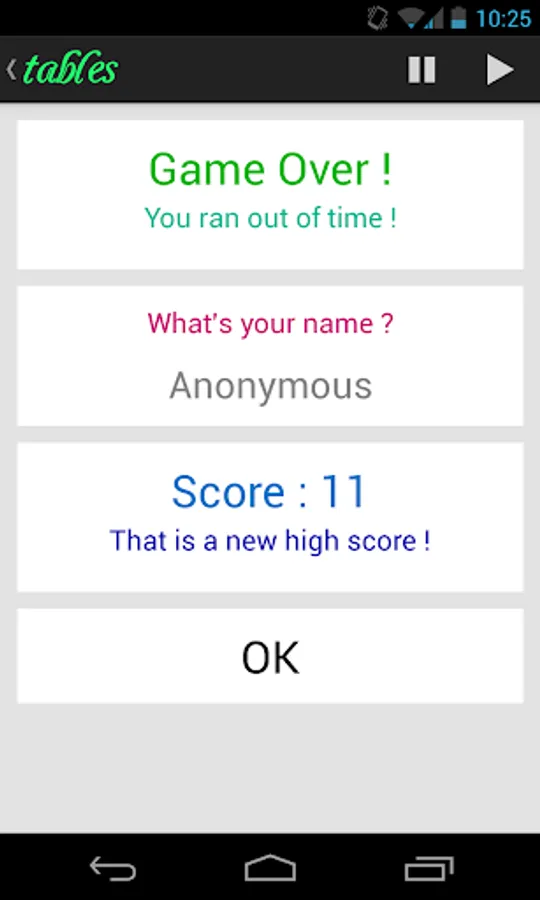 Tables will make things funnier ! Now, learning multiplication or addition tables is a game ! In Tables, your smartphone will randomly choose a question to ask you - depending on which tables you chose to learn - and you have to answer as fast as possible ! If you're too slow ... you lose ! The goal is to answer as many questions as possible !