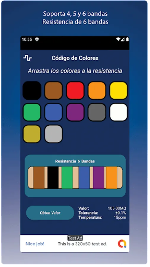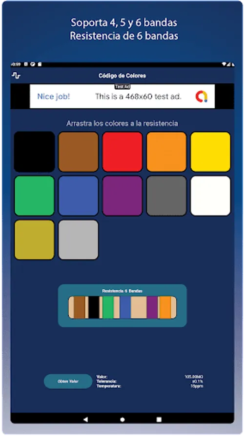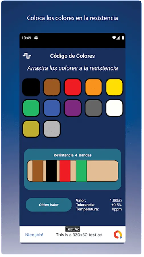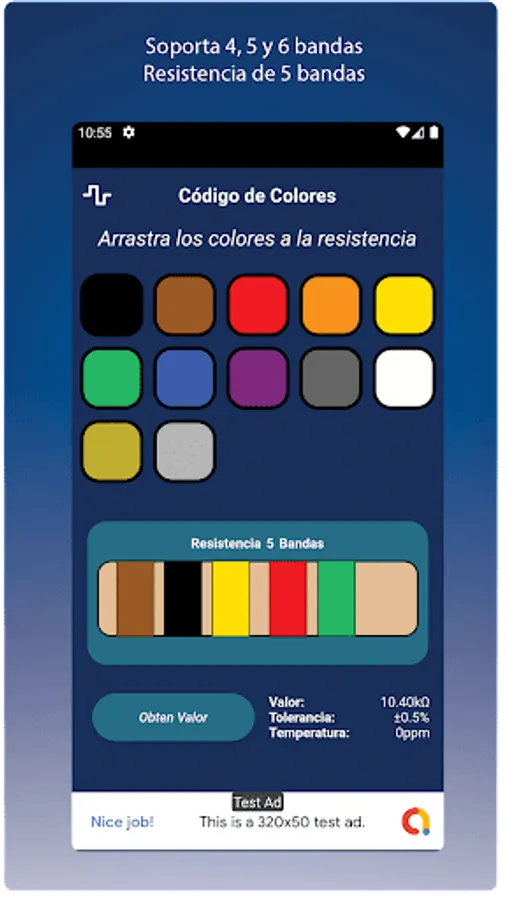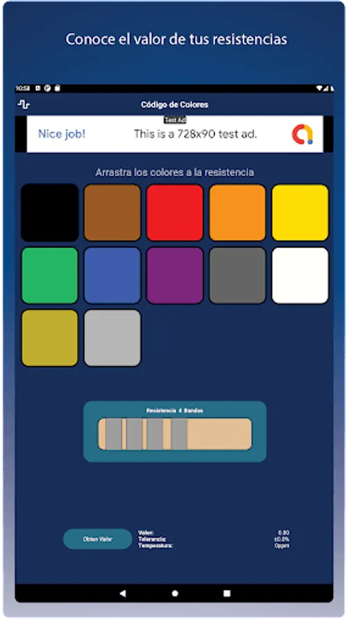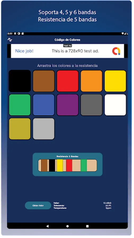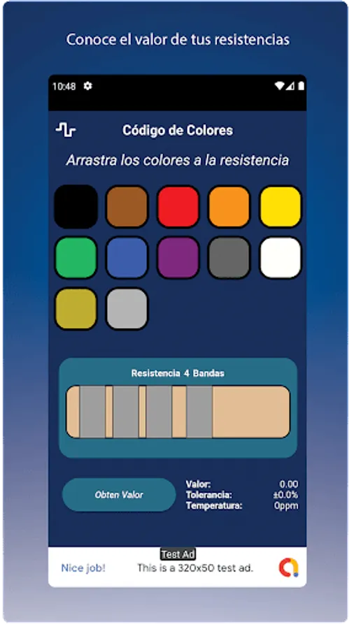 An empty resistor is presented, just drag the color to the corresponding band and calculate its value. This tool is very useful in the electronics area since we cannot always have a multimeter or it is difficult for you to memorize the color code.