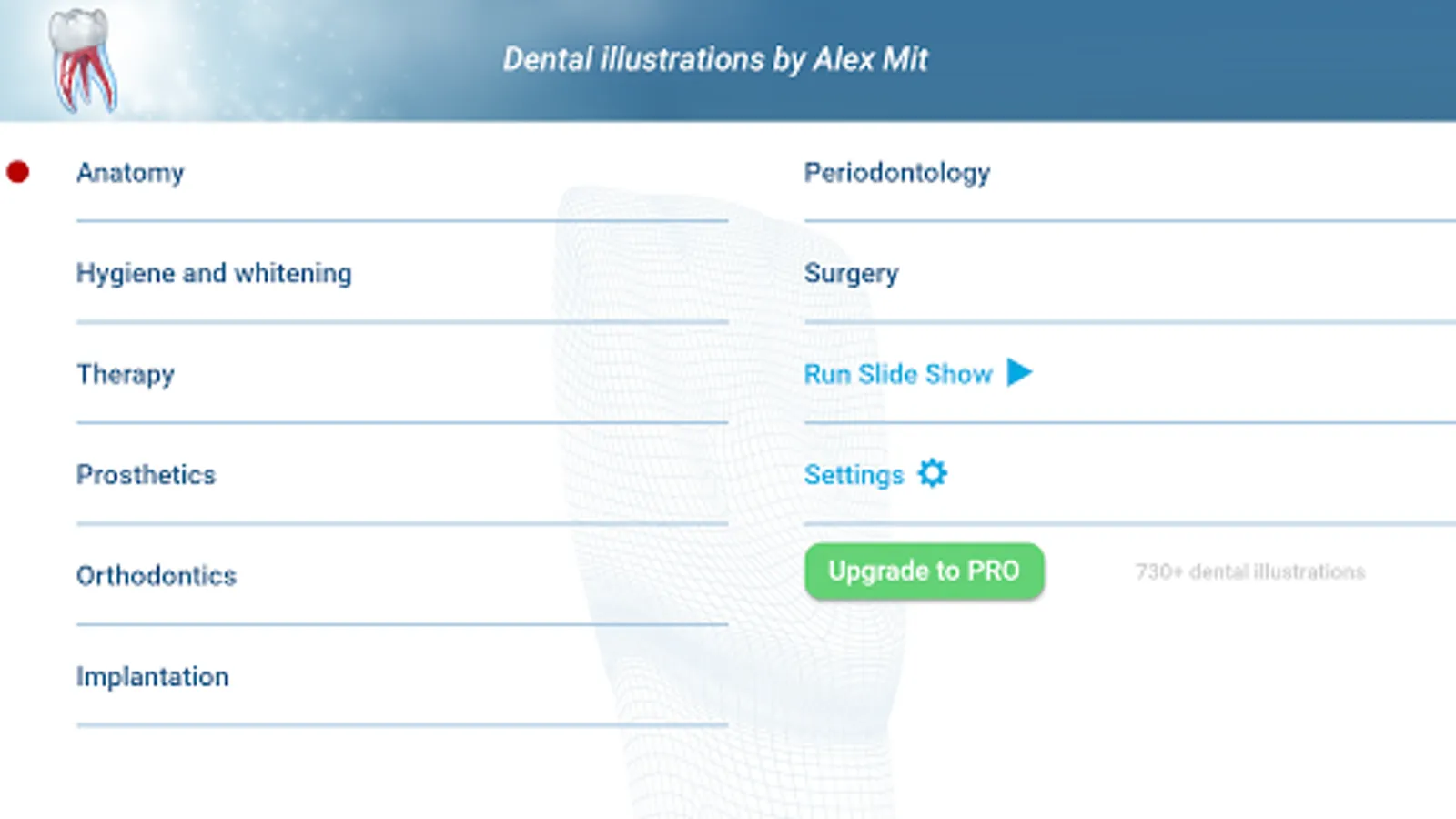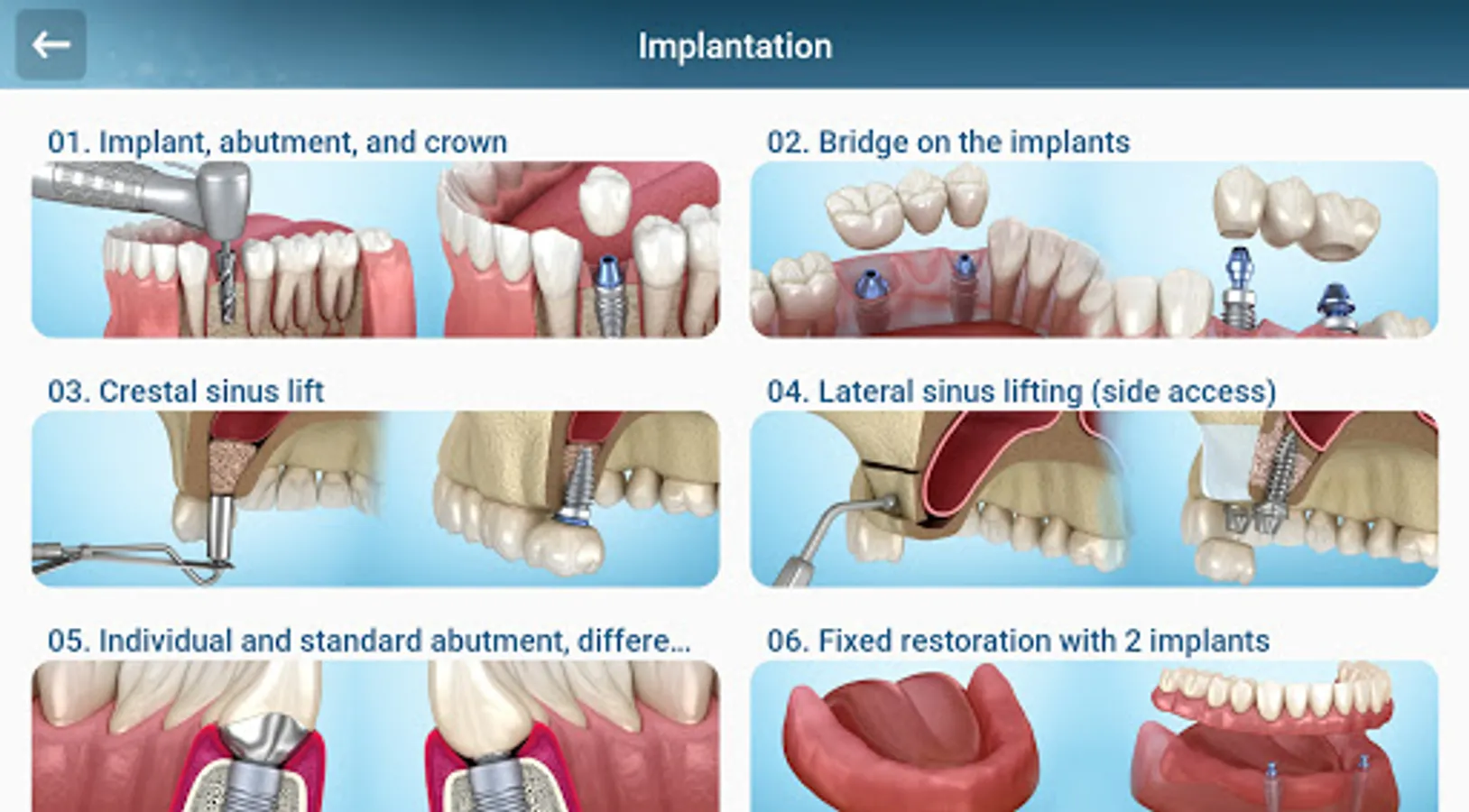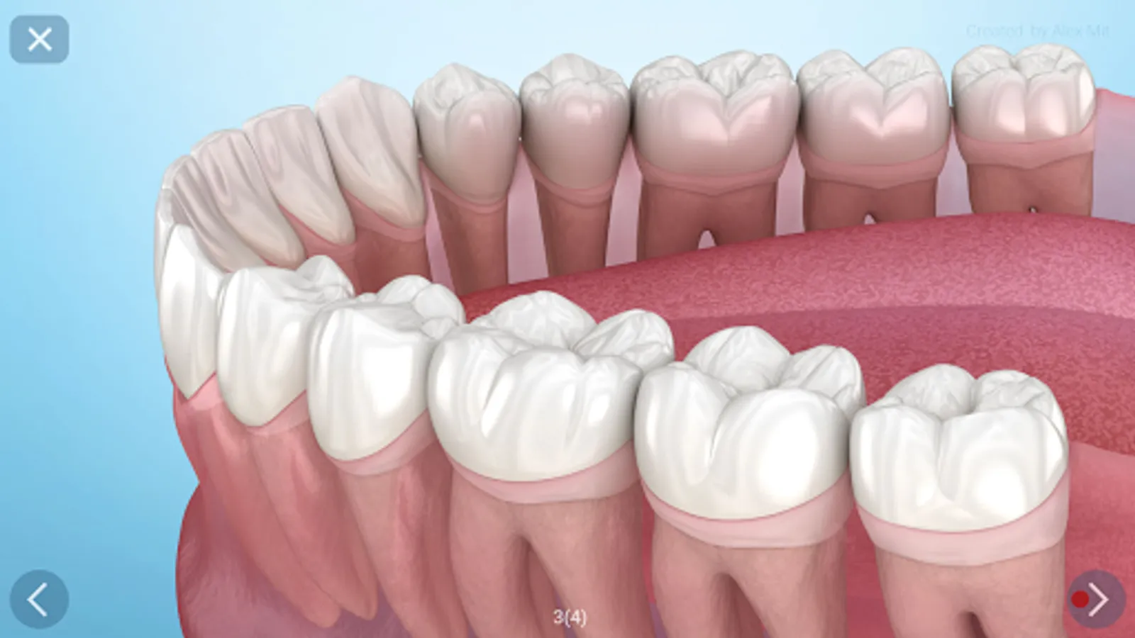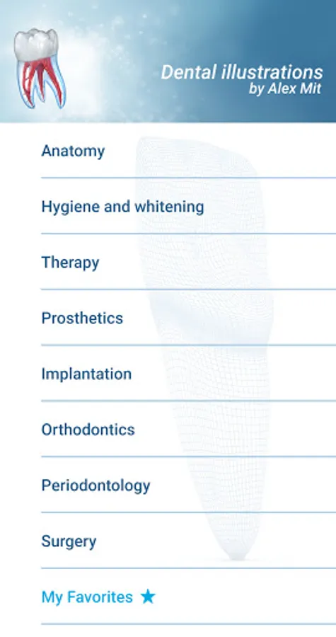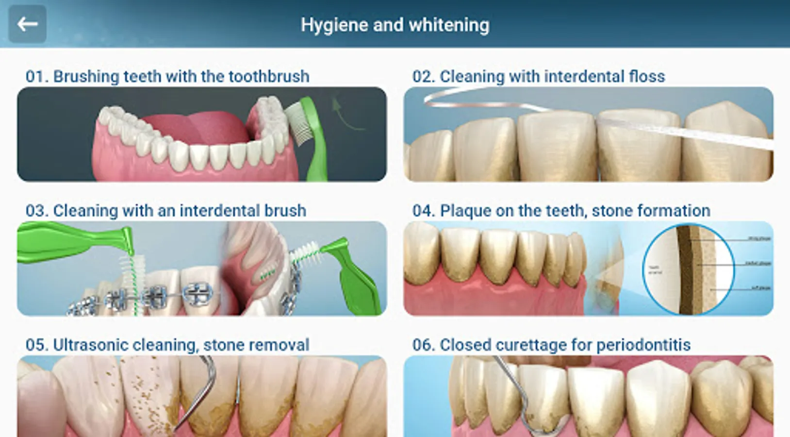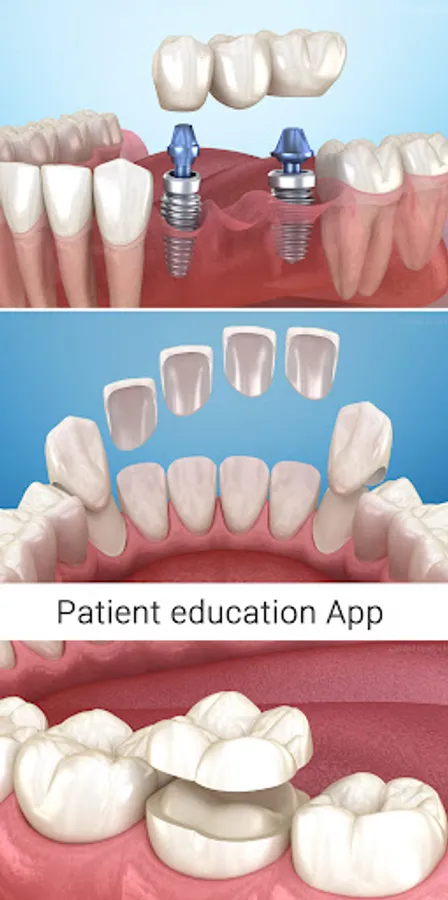 This dental application is designed for professional dentists who want to advise their patients more effectively. A large collection of 3D illustrations of dental treatment is sorted into groups and located inside this application.