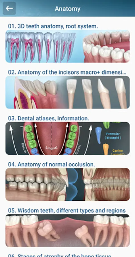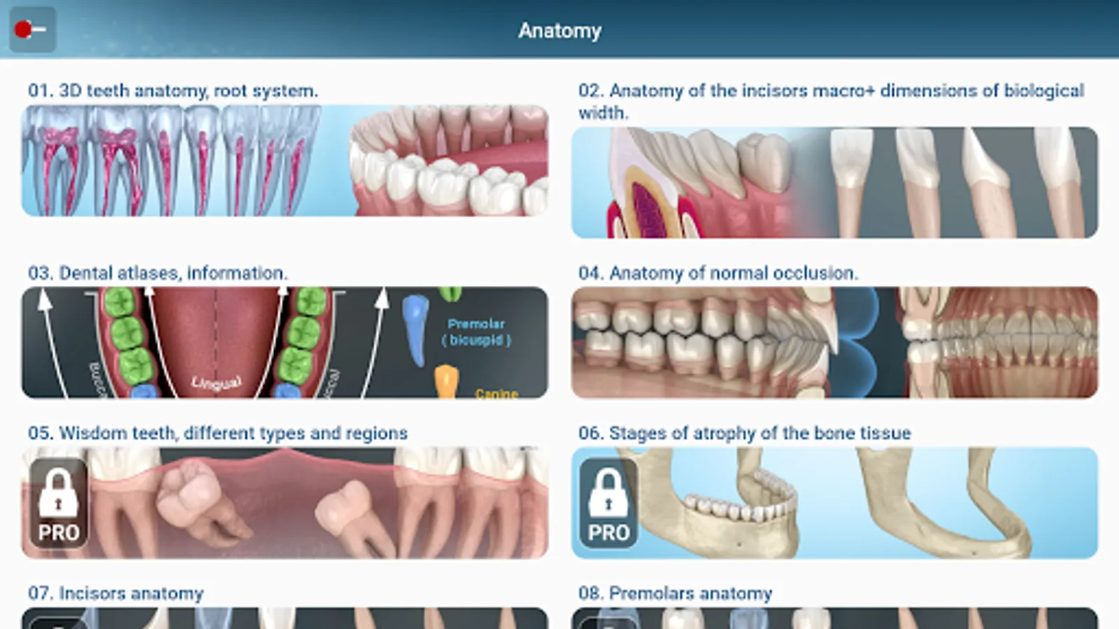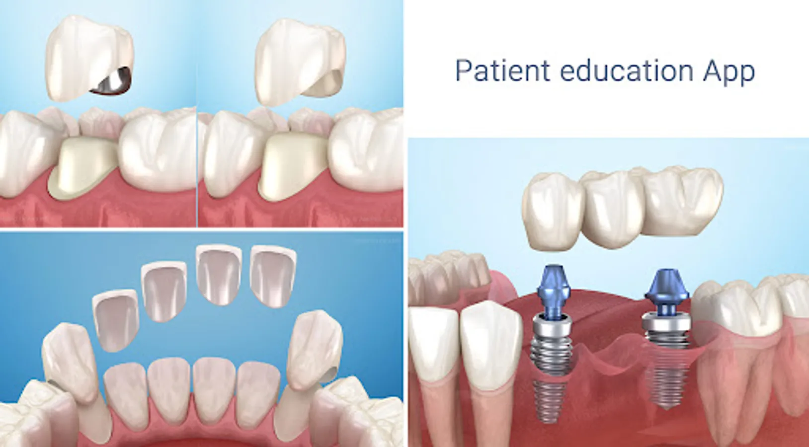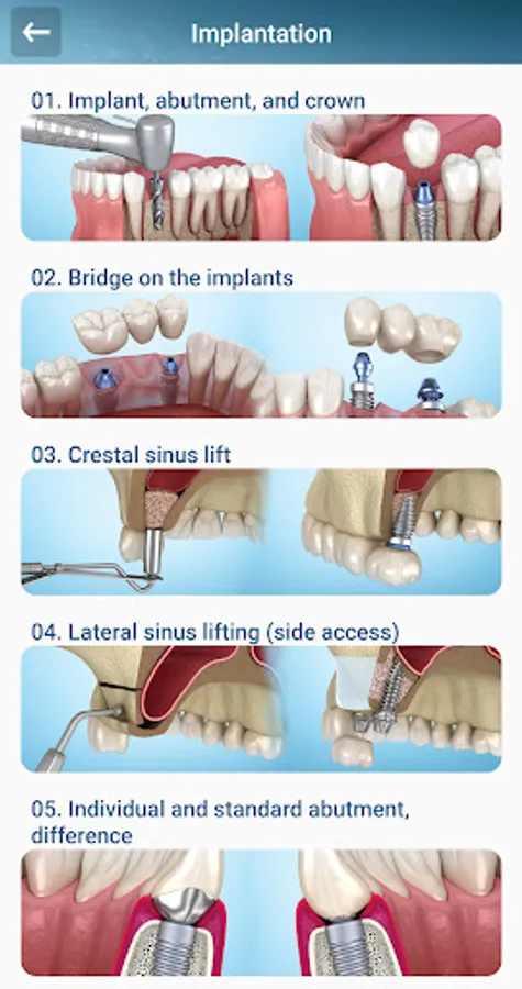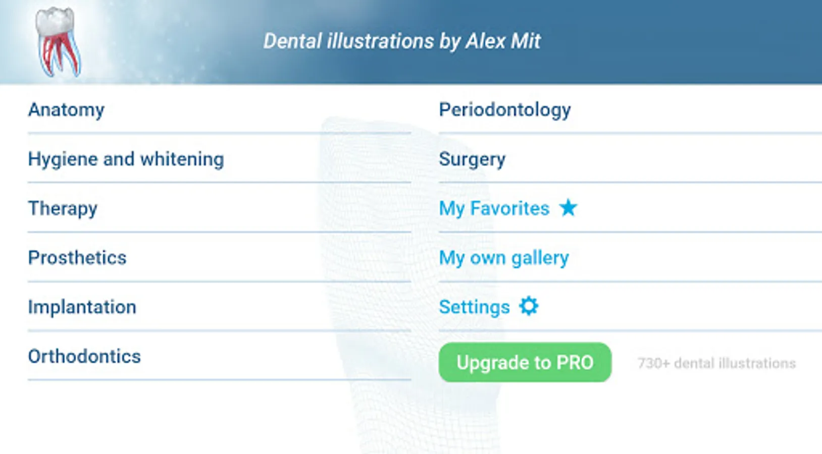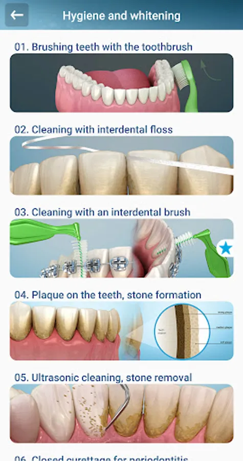 This dental application is designed for professional dentists who want to advise their patients more effectively. A large collection of 3D illustrations of dental treatment is sorted into groups and located inside this application.
