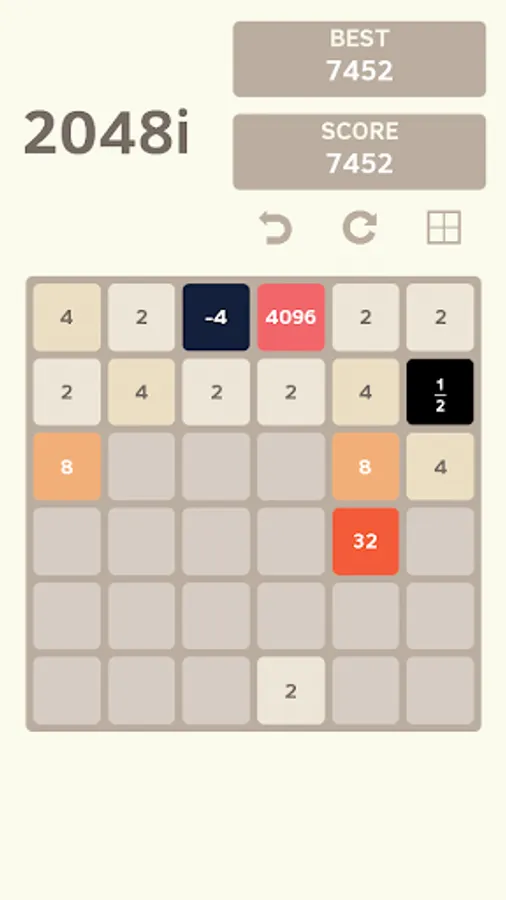 Swipe up, down, left or right to move the tiles. This version of 2048 includes: negative numbers, multiplications, divisions(which implies fractions), squares, square roots and also imaginary numbers.