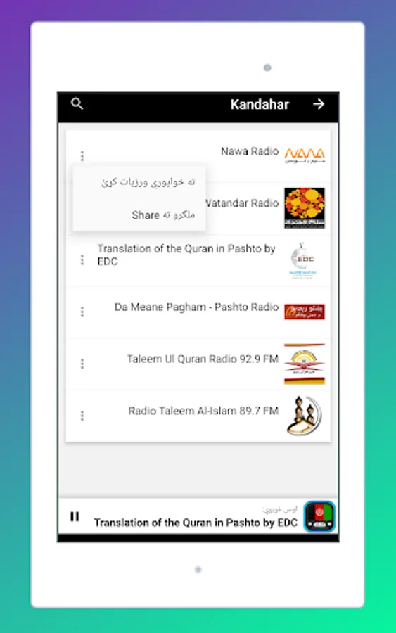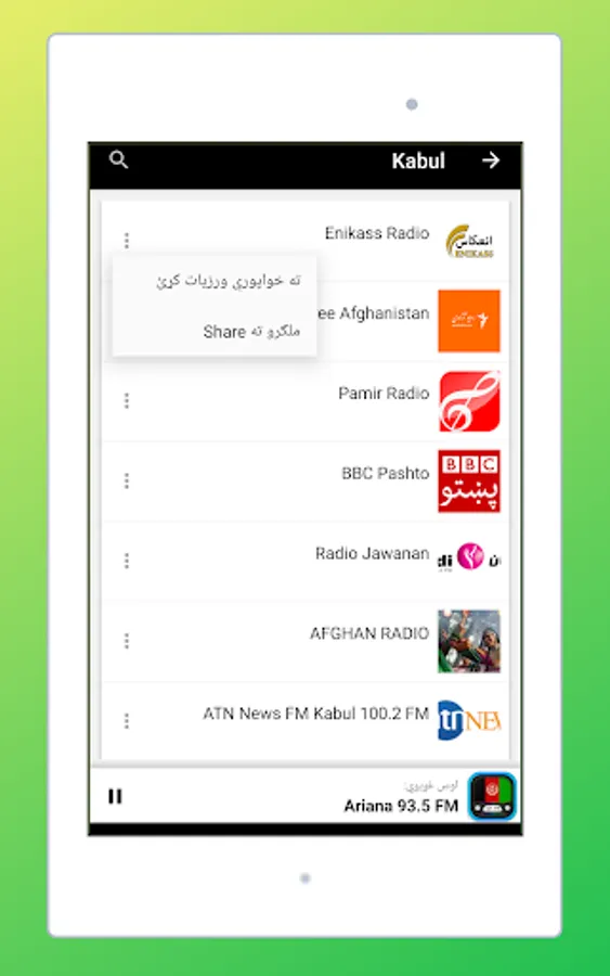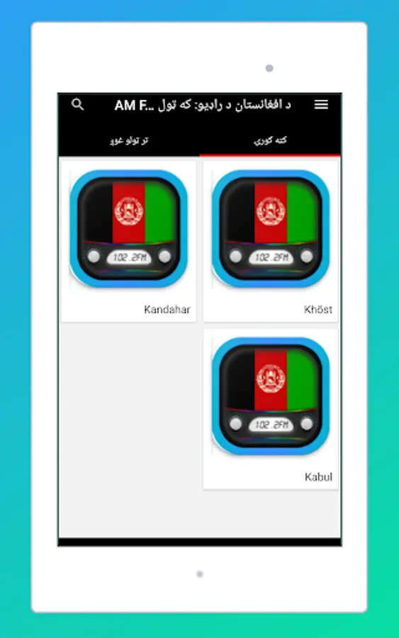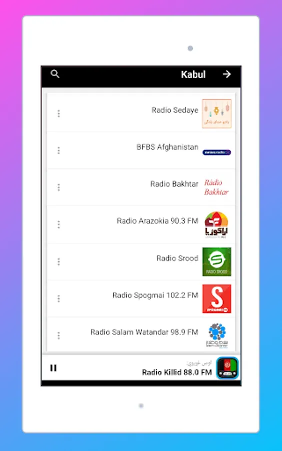 The Start screen and the interface of this application online radio stations of Afghanistan is elegant, and the most important thing is that it is very easy to use. As a user, you don't have to look for normal radio Frequencies. Just touch the name of your favorite Afghanistan radio and start listening live.