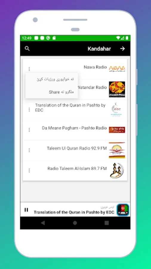 What is listening to live music Afghan from your mobile? This is an application of Afghan radio stations, but it uses Internet connection Instead. You can listen to Afghan music, Afghanistan songs or online music, without having to tune in or find the radio Frequency. You can even access the live radio in Afghanistan with just one click, either FM or AM. Just touch the name of your favorite Afghan radio to start listening. Apart from Afghanistan music and songs, you can also listen to the best and latest entertainment news through our top free live Afghan radio Stations.
