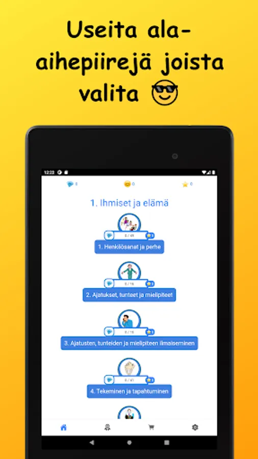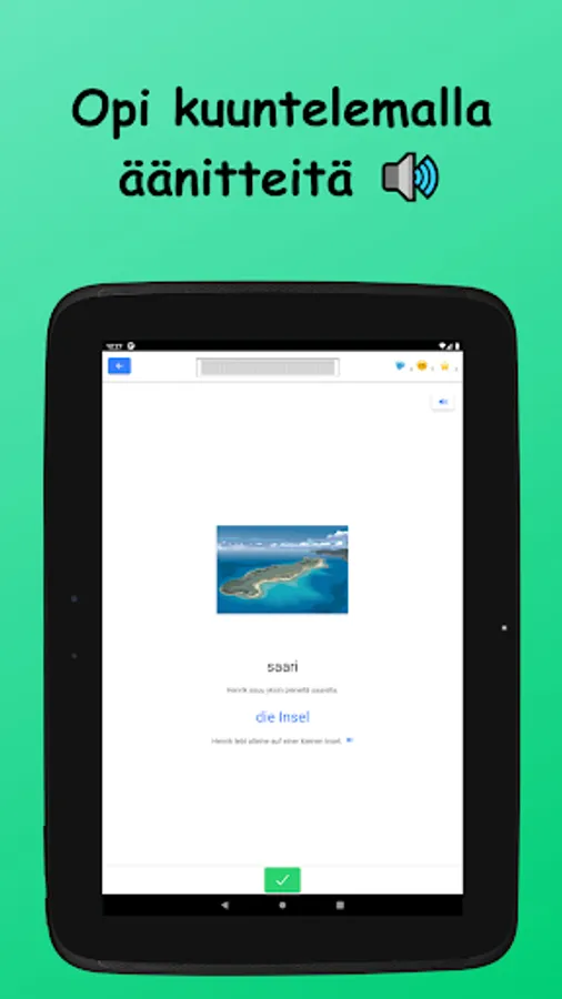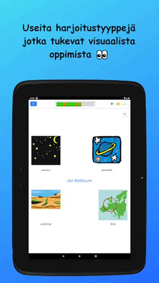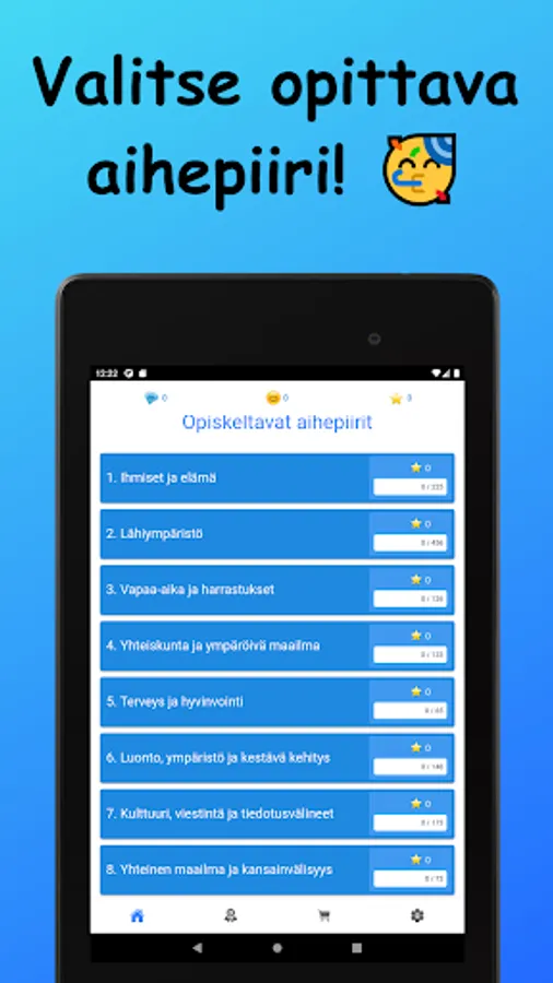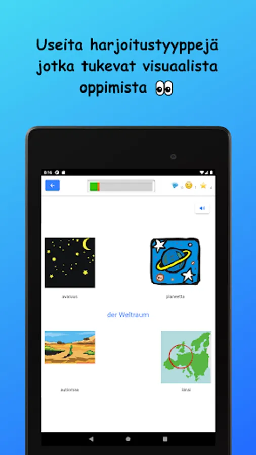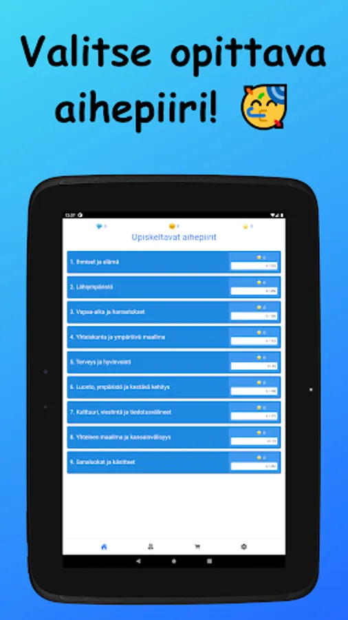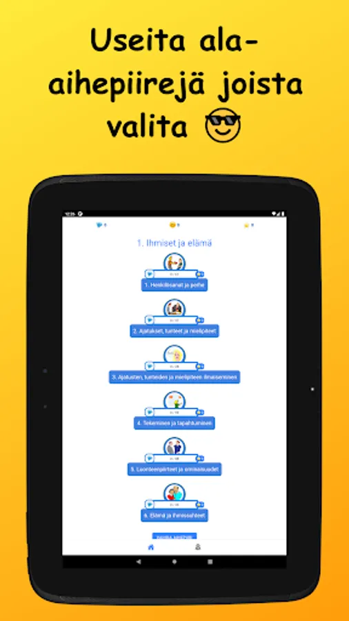 Learn German vocabulary in Finnish! The words studied in the basic subject vocabulary are divided into nine main subject areas and 42 sub-topics. Vocabulary is learned through a variety of tasks by reading, writing, and listening to words. There are also example sentences for all words.
