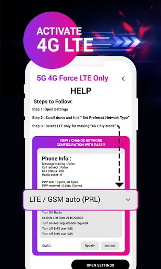 This app helps you to find and search for 5G(If Supported)/4G LTE stable signal. Once you locked to 5G(If Supported)/4G LTE Mode, no other 2g/3g signals won't be catch by your phone so your device will always be in 5G/4G LTE Only Network.