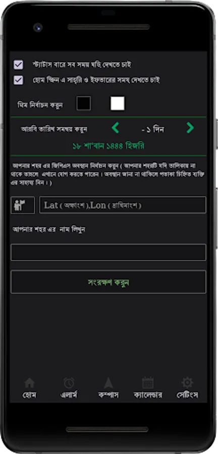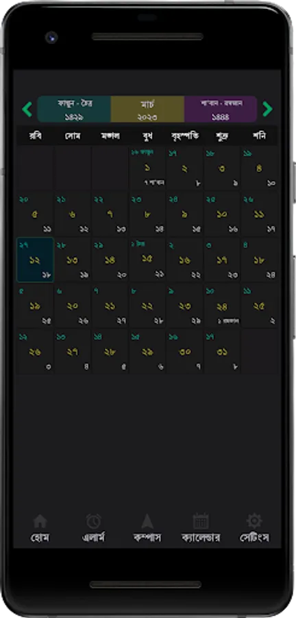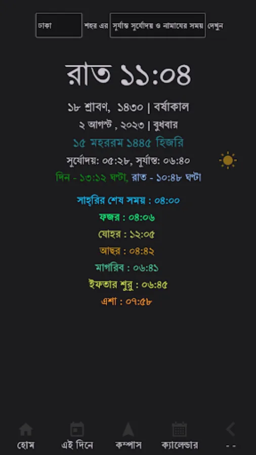 It also show the Bengali day, months and seasons name , day and night length in hour:minute