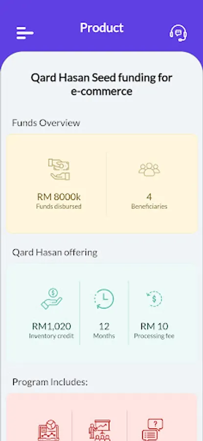 We offer RM1,020 as seed financing based on Qard Hasan social finance for eligible beneficiaries (borrowers) to start an e-Commerce business. There is only a 1% processing fee and no profit rate (interest rate) chargeable over the 1 year tenure. Business training and financial literacy education are also integrated into the program to help train the beneficiaries.