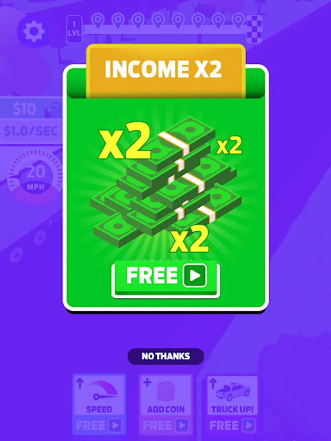 As you speed along, you'll have the chance to grow your truck in size and speed. Boost your vehicle to higher levels, and watch as your earnings increase with each upgrade. And remember - the faster you go, the more you earn. But be careful - the road is full of surprises!