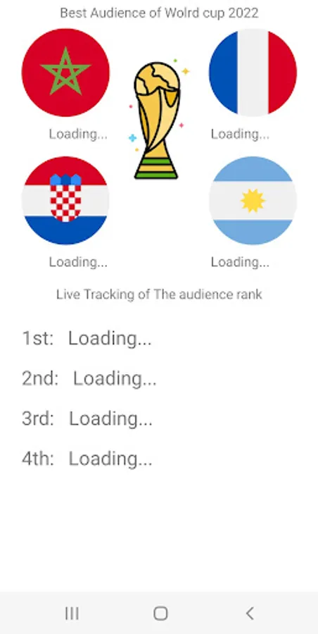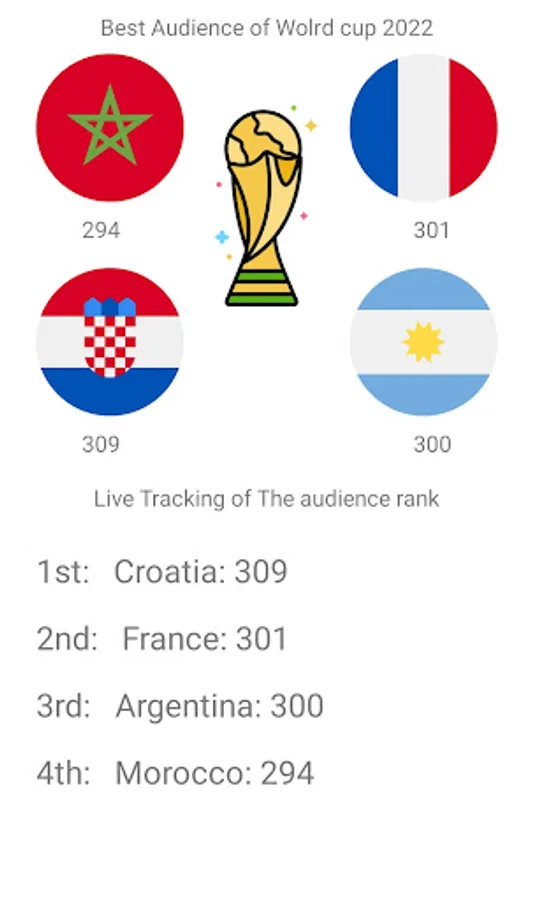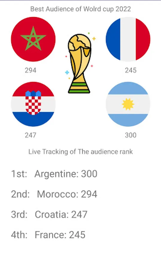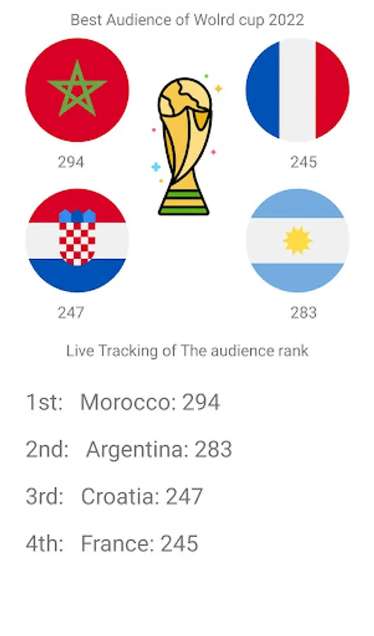 The application includes a live tracking of the 1st, 2nd, 3rd, and 4th place of the football championship 2022 audiences.