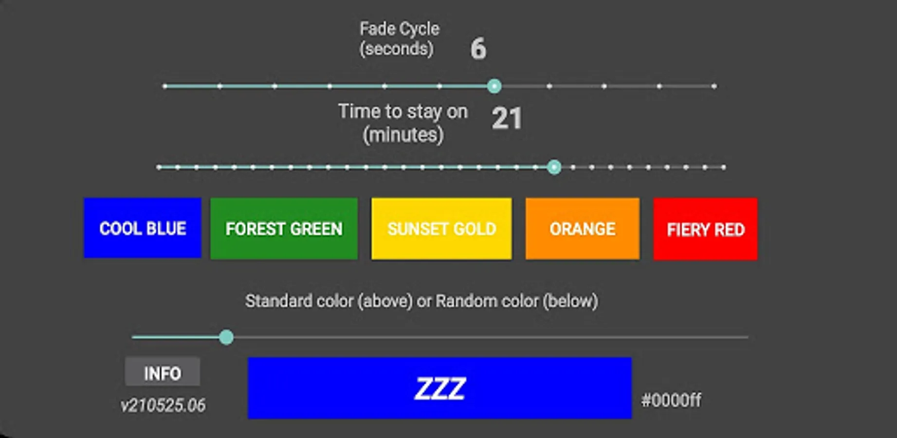 SleepWyz allows you to choose a color, fade cycle, and time to run. The color cycles full-screen on and off in a relaxing manner. Put in your field of vision, or reflect off the wall or ceiling for a soothing environmental experience at night. Calm yourself to sleep by matching your breathing rhythm. Take a quick meditation break during the day. Use for self-hypnosis.