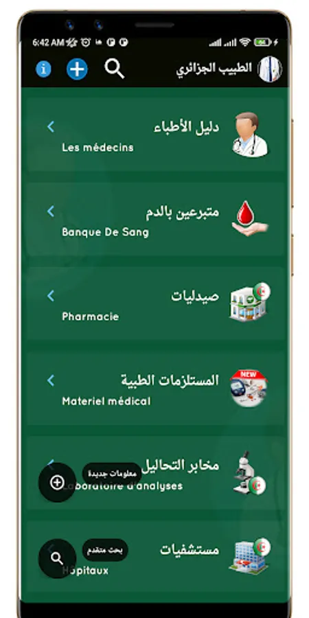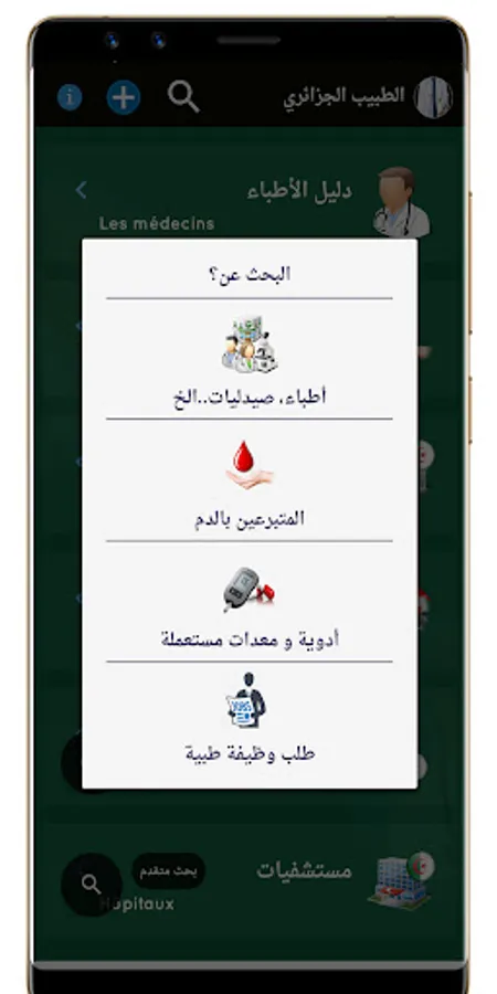 Doctor Algeria application - the second version of the Doctors Algeria application or Doctors of Algeria, is a comprehensive application that provides users with information about health services throughout Algeria. The application contains a comprehensive directory of Algerian doctors in addition to information about blood donors, pharmacies, hospitals, eyeglasses shops, civil protection, and alternative medicine.