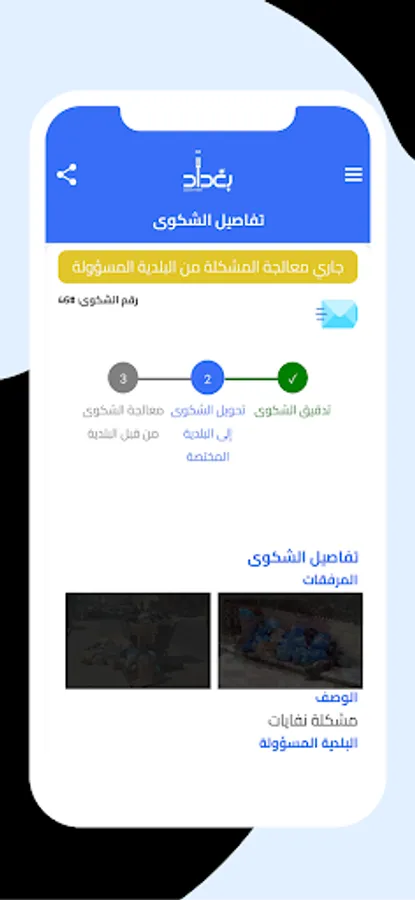 Through the Baghdad - Citizen Voice application, you can send pictures and attachments related to any complaint, in order to clarify the problem accurately, and solve it by the Baghdad Municipality and its affiliated municipalities.
