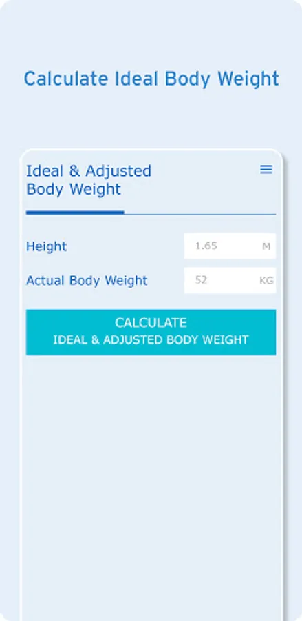 An adjusted & ideal body weight calculator is also built into the application for easy calculation of the volume of fluid your patient requires.