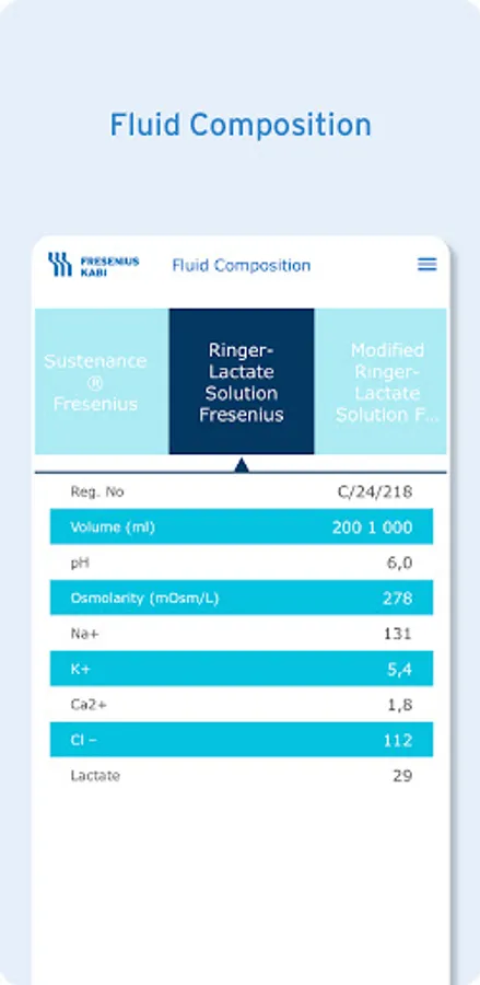 Fluid composition tables are available to view the components of each intravenous solution. These are listed along with product registration numbers, and the volume that the solution is available in.