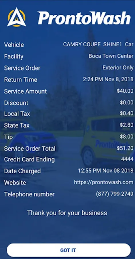 Welcome to the ProntoWash App where you can schedule and pay for your Hand Car Wash and Detailing services in under a minute! The ProntoWash app simply and conveniently allows you to have your vehicle cleaned and detailed wherever you are. Just select your vehicle type, your location, the service you would like, and pay - we do the rest! With convenient locations all over the world, you're never more than a few clicks away from a clean vehicle. Traveling? Dining? Stuck at the office? - No problem! Check to see if we're available at your location from our constantly-growing list of service locations. Simple and convenient. ProntoWash - We Shine!