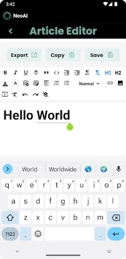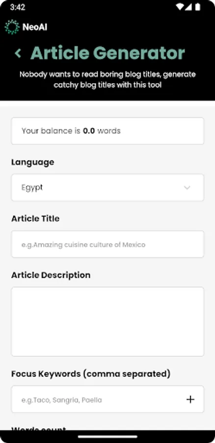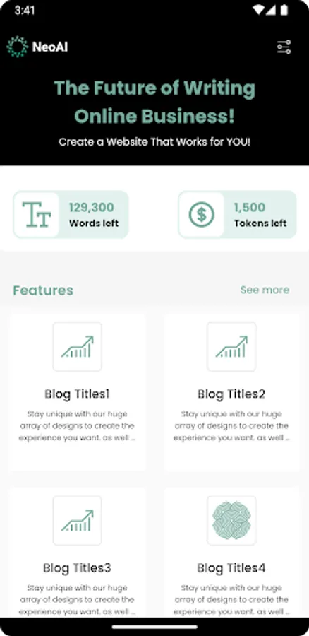 Introducing Neo AI that makes content creation a breeze - with the power of AI, Neo AI allows users to generate high-quality articles and images using the advanced text-generating capabilities of AI. With just a few taps, users can input their desired topic and receive a well-written article that is engaging, informative, and completely original. Neo AI also comes with an image generator that uses AI to produce stunning visuals to accompany the article. The interface is user-friendly and easy to navigate, making content creation accessible for everyone. Say goodbye to writer's block and hello to unlimited inspiration with Neo AI