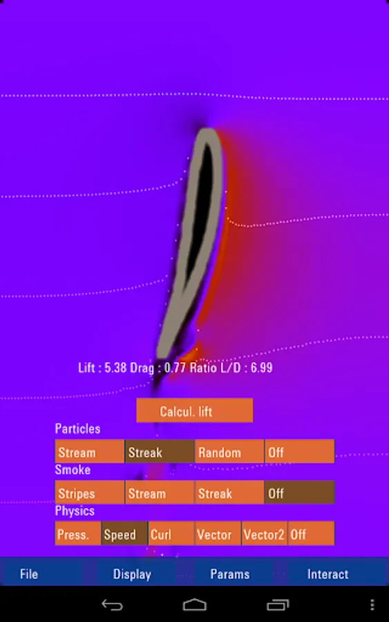 • visualization modes : particles (streamlines, streak lines and random), colored smoke (predefined stripes, streamlines or streak lines), pressure field, speed norm visualization, curl (visualize turbulences), velocity field (visualize speed direction) combined with speed norm or curl.