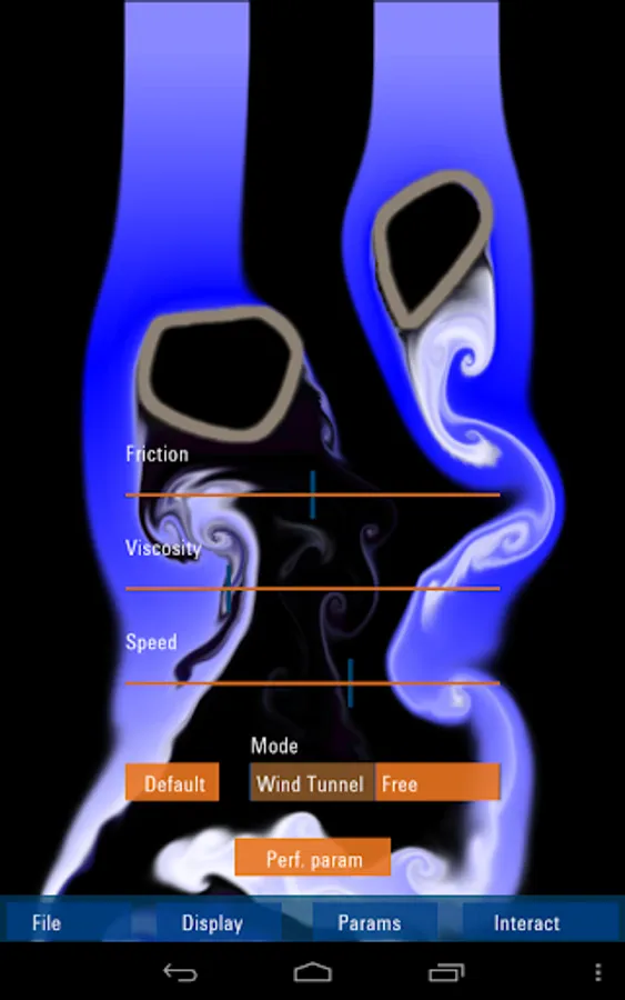 • Adjust physical parameters : fluid viscosity, obstacle friction, wind tunnel input speed.