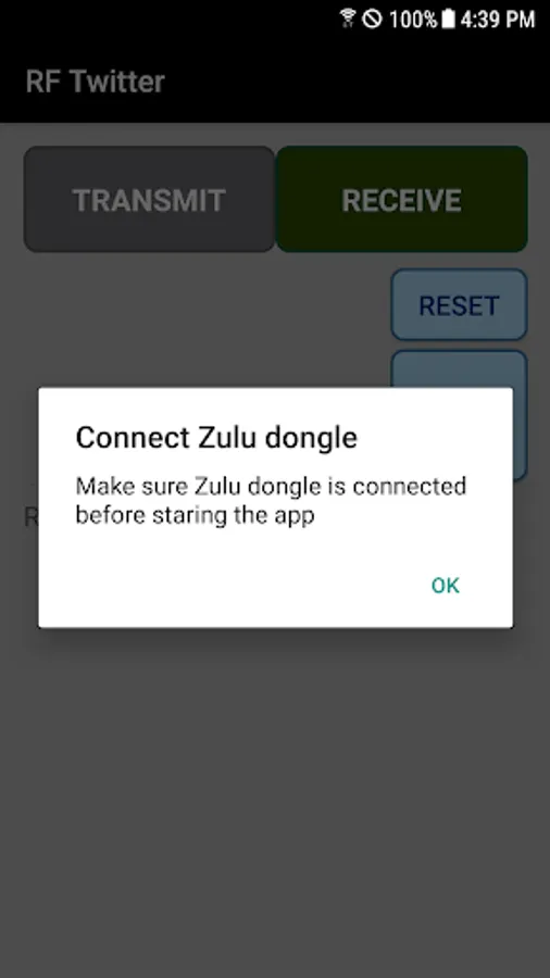 Make sure the ZULU dogle is connected to the smartphone before starting the app. Start the app through the Zulu-dongle driver select popup message.