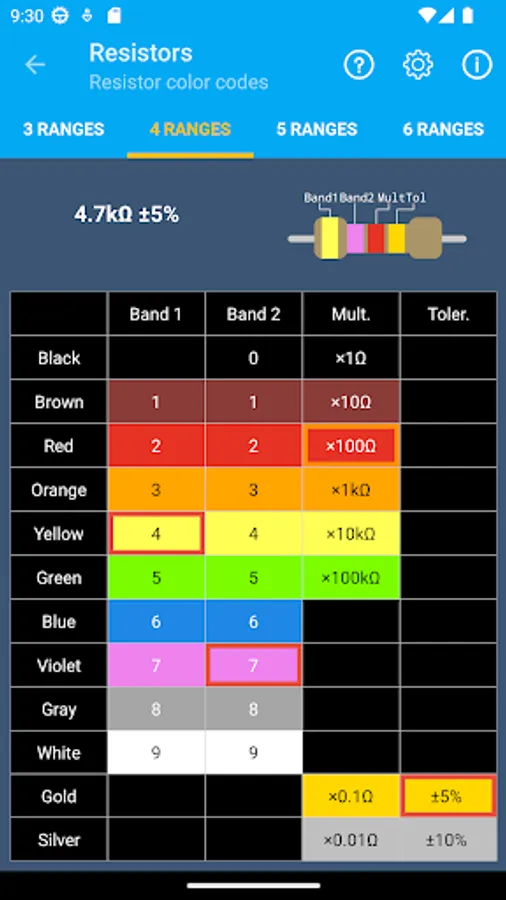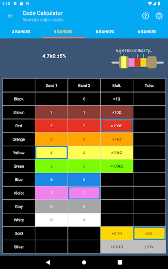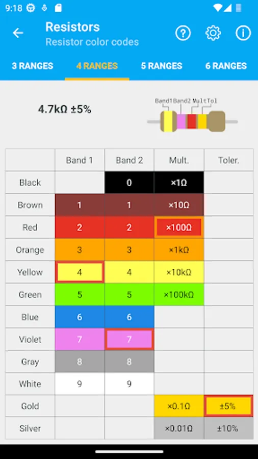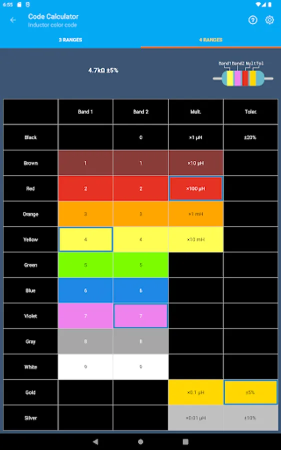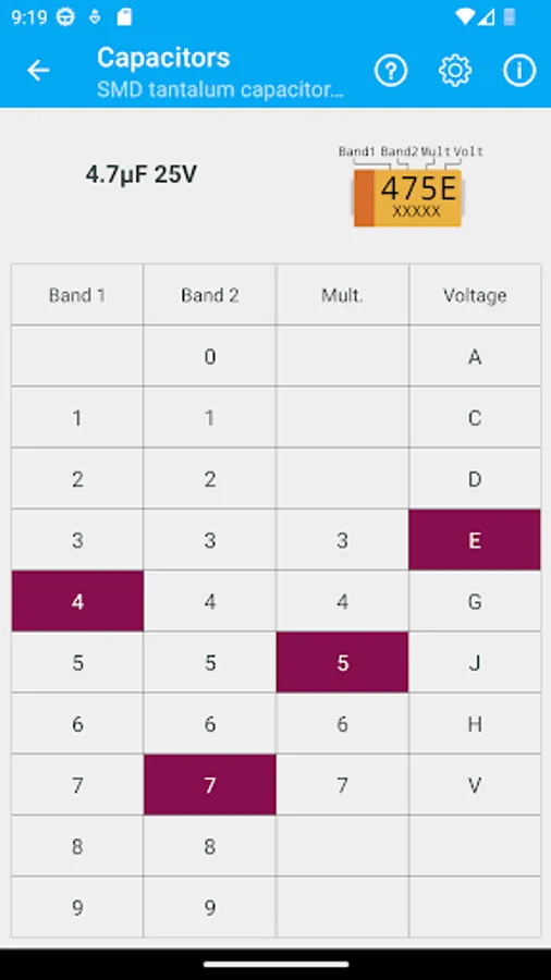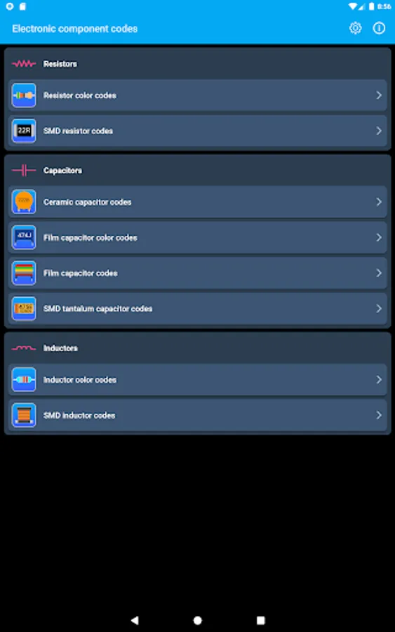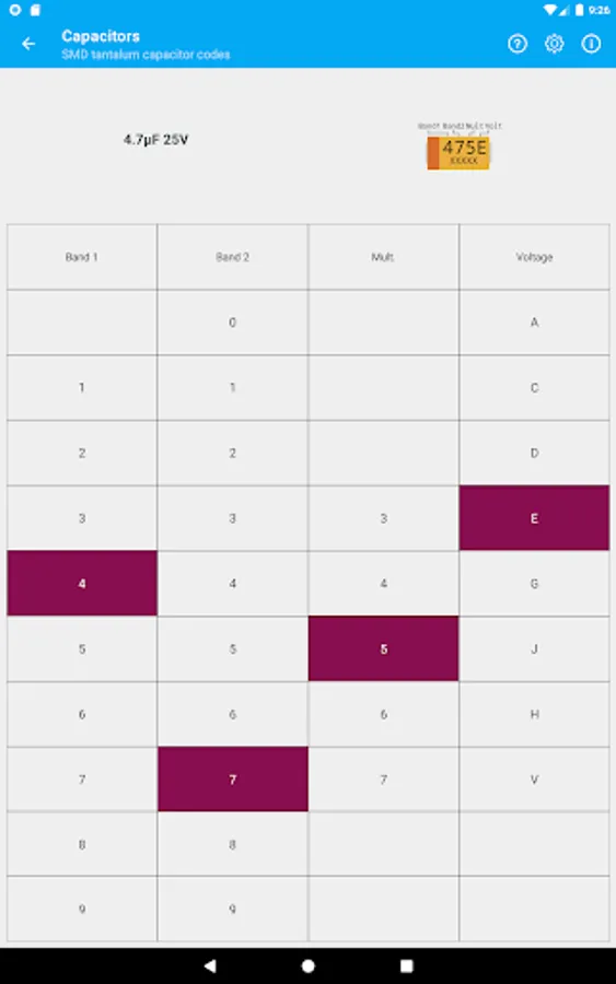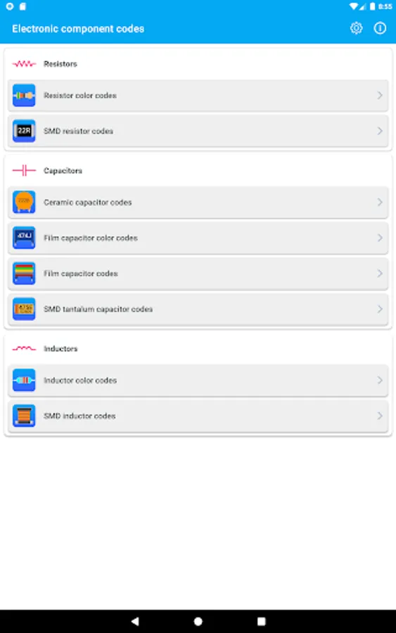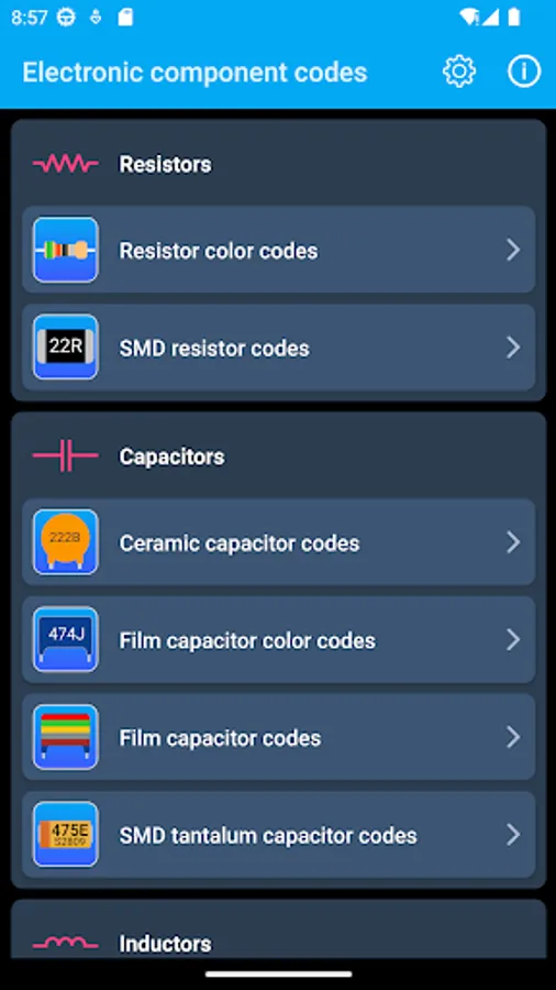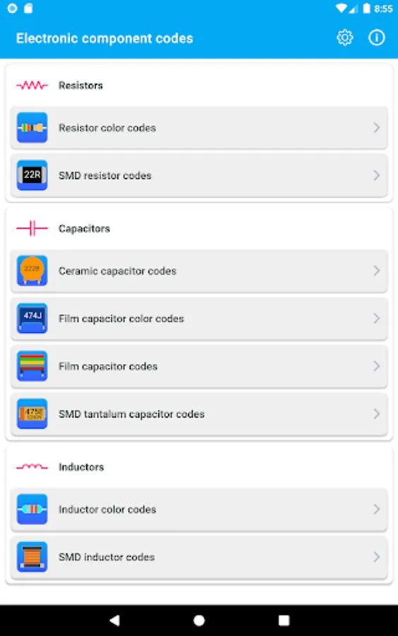 Application for reading codes for resistance, capacitance and inductance of electronic components.