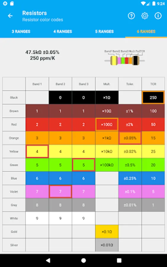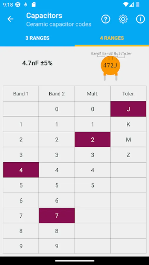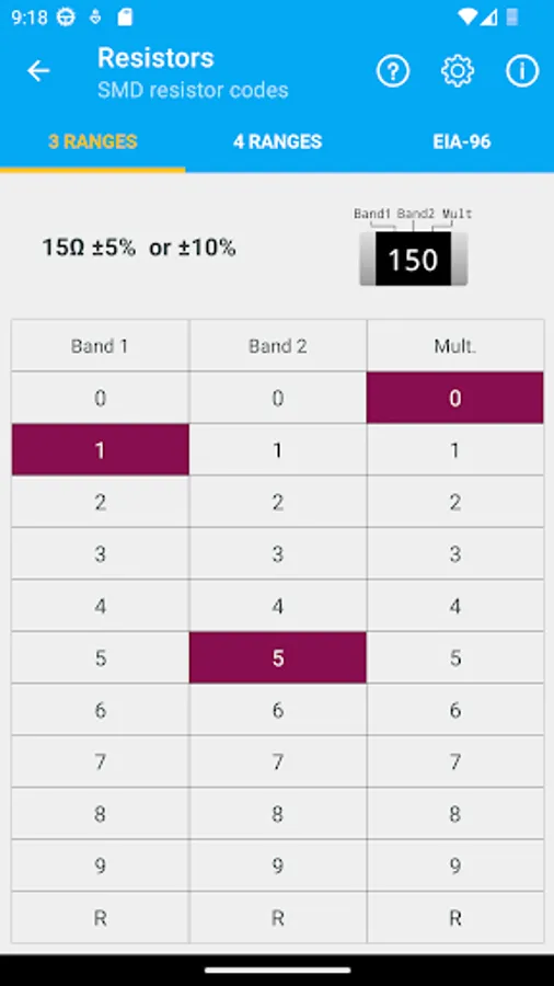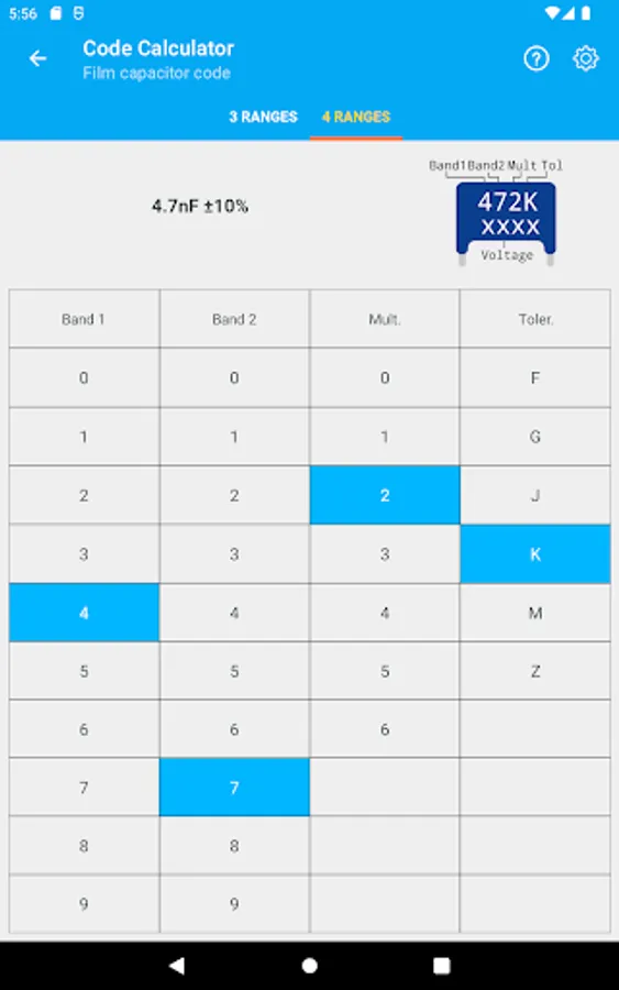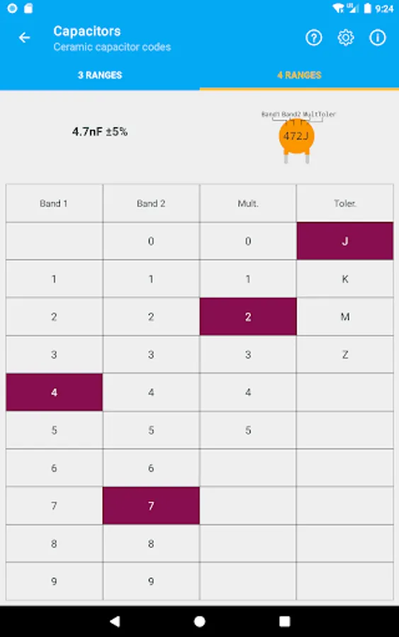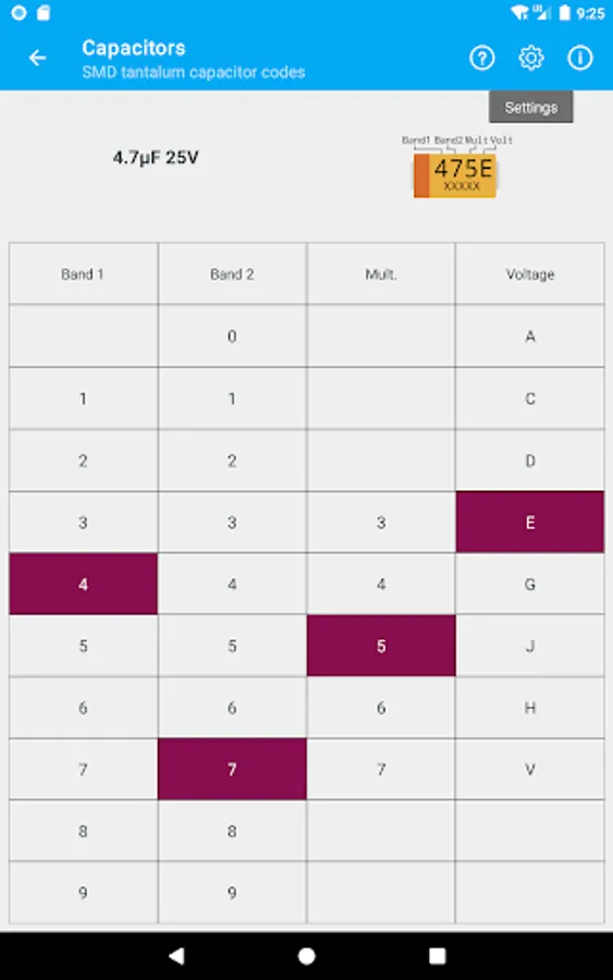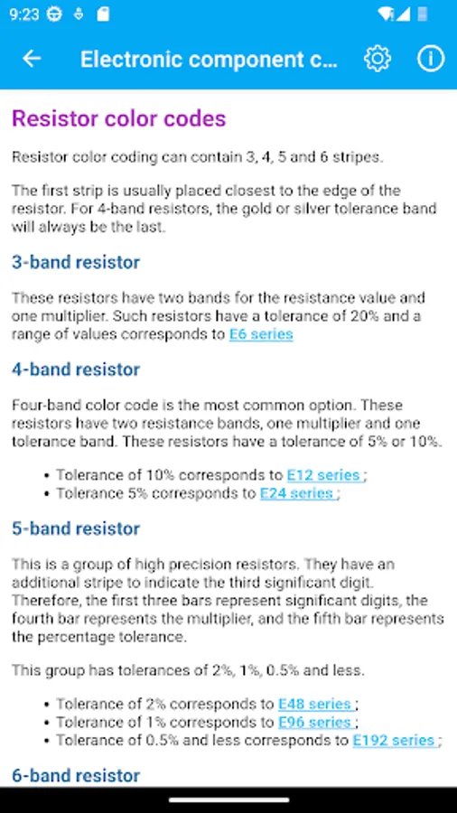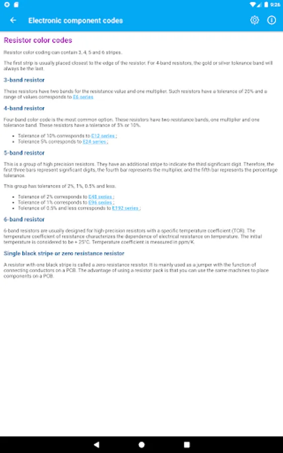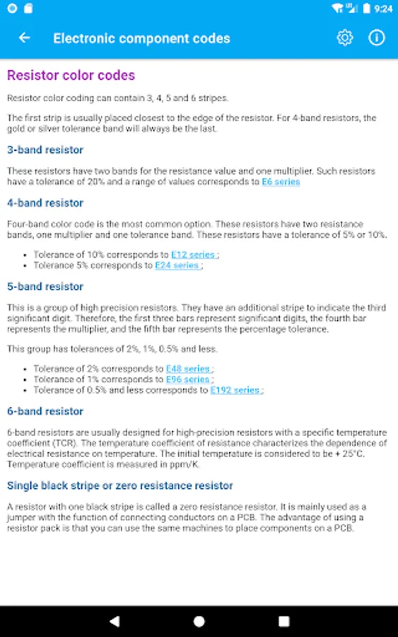 Application also contains help and detailed description for all codes of electronic components and lists of standard values for E series.