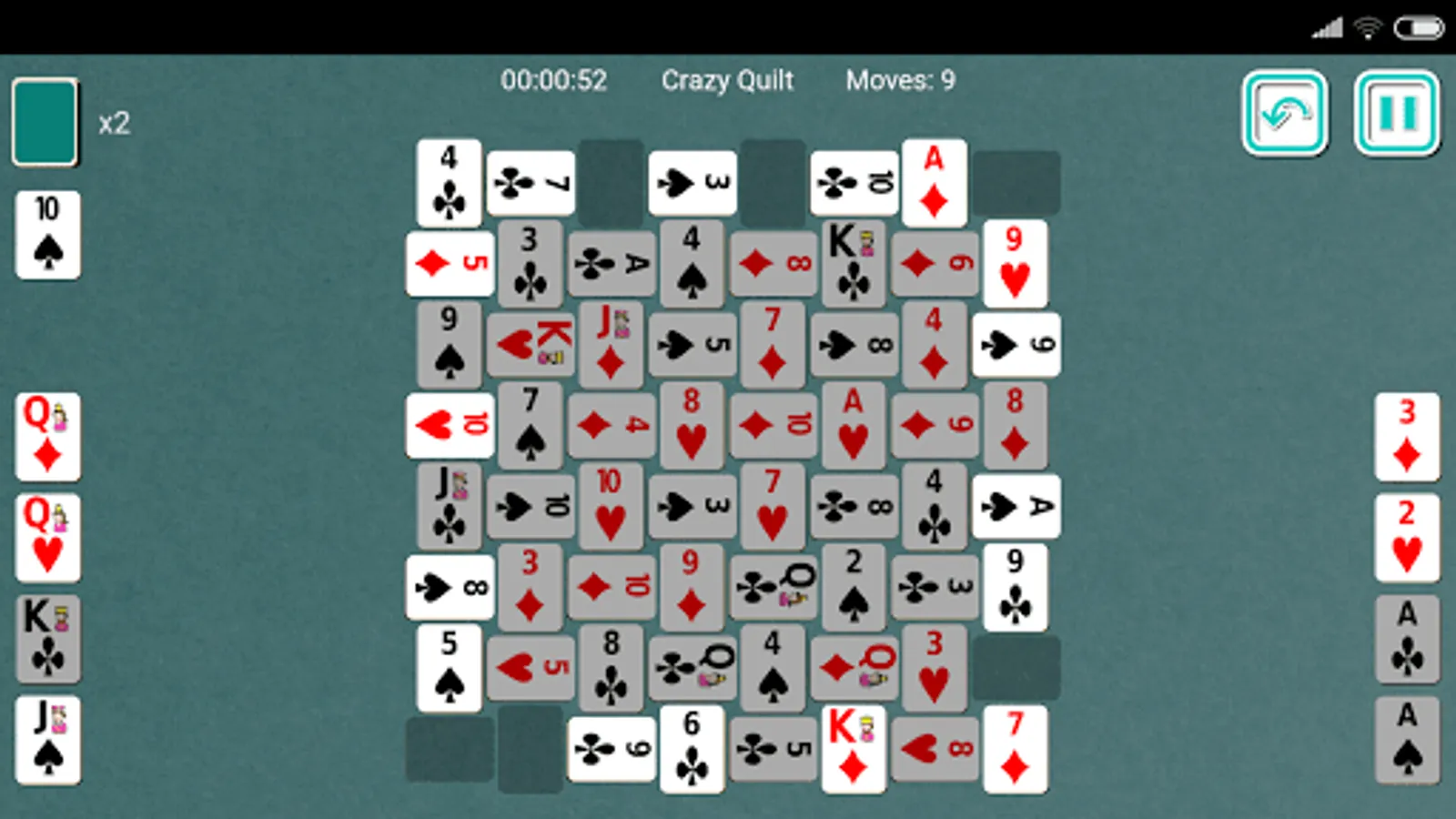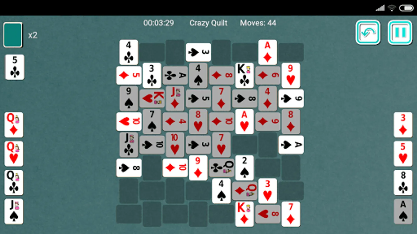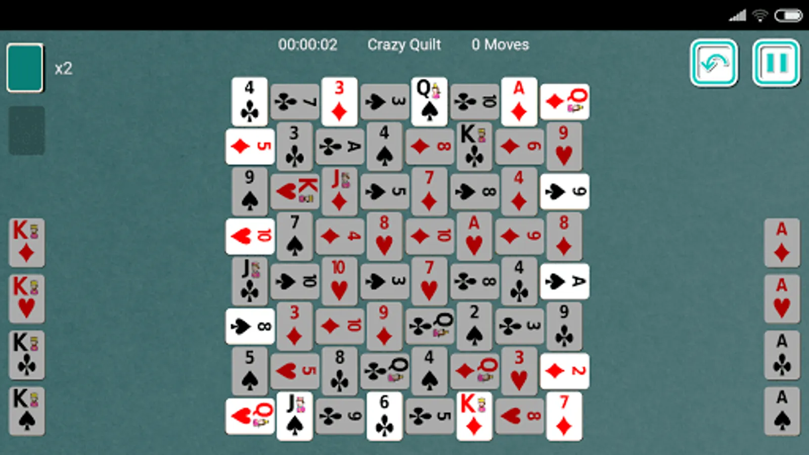 Crazy Quilt (also known as Indian Carpet and Japanese Rug) is a solitaire card game using two decks of 52 playing cards each. The name of this game is derived from the setup of tableau cards which resembles a carpet or a quilt. The aim of Crazy Quilt Solitaire is to move all cards to the foundation by arranging 4 foundations in ascending order of Ace to King and remaining 4 foundations in descending order of King to Ace.